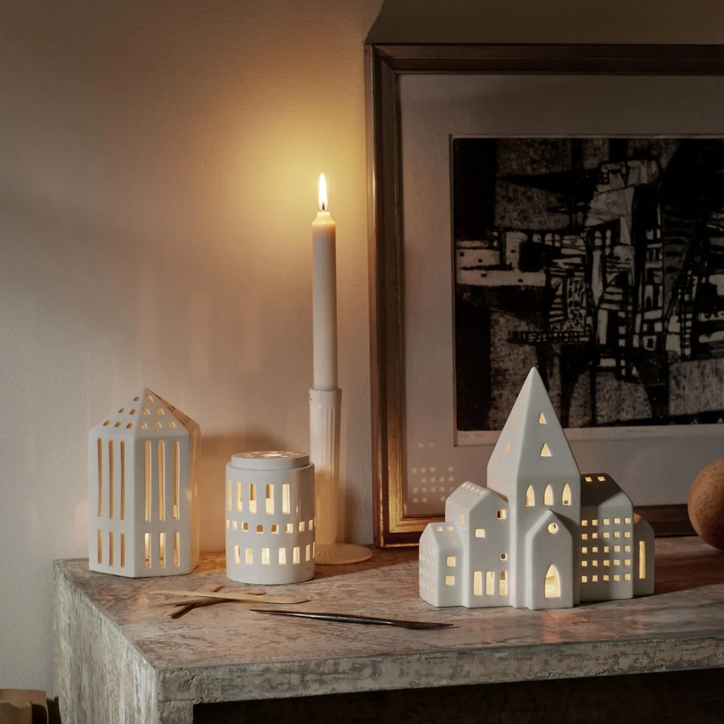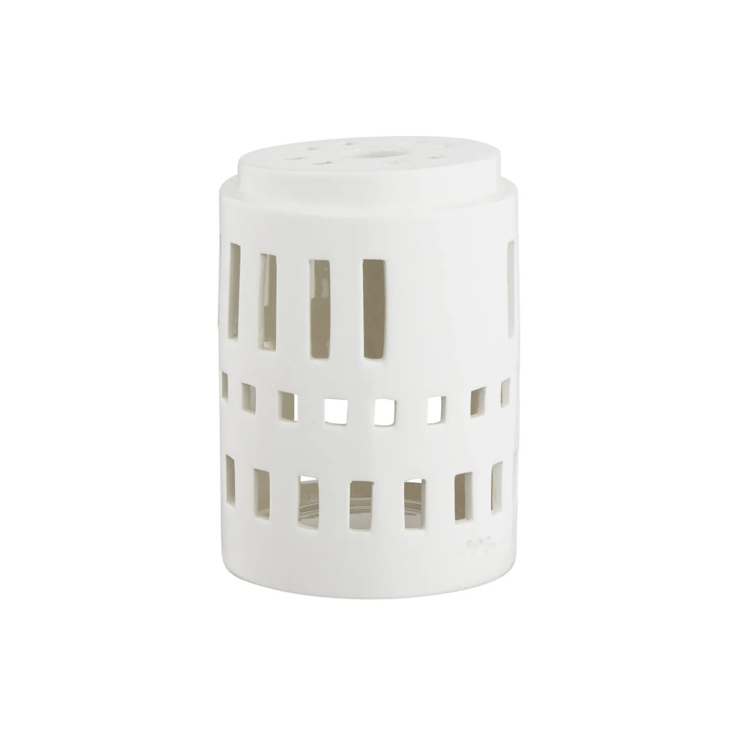 Urbania-lyshusene er alle arkitektonisk inspireret af fortidens, nutidens og fremtidens arkitektur. Det lille tårn med de mange fine små håndskårne vinduer i varierende størrelser skaber smukke og betagende lyssilhuetter og er en lille udgave af det større Tårn i serien. Skab et personligt og yndigt tableau med de andre lyshuse, eller lad det lille tårn stråle alene.
