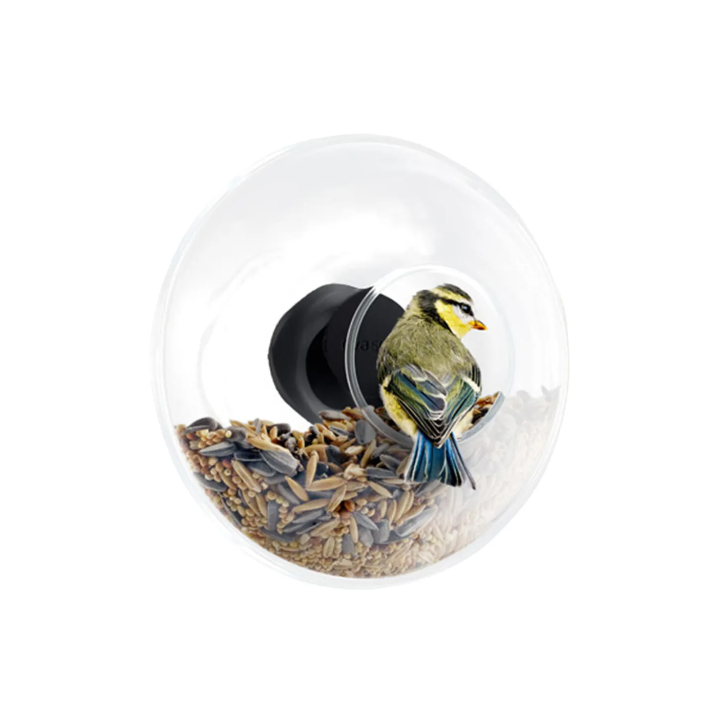 “Kom helt tæt på det mangfoldige fugleliv udenfor vinduet. Eva Solo Fuglefoderkugle er af glas og monteres direkte på ruden. Foderkuglens åbning gør det nemt for småfuglene at sætte sig på glaskanten og spise. Imens giver den gennemsigtige kugle rig mulighed for at studere de forskellige fuglearter på helt tæt hold.Foderkuglen monteres via dobbeltklæbende tape på ydersiden af vinduet, hvor den syner diskret og elegant. Frø hældes i kuglen via hullet og kan rumme op til 90 ml. Ved rengøring fjernes glasset nemt. Glasset er frostsikret, og foderkuglen tåler alle årstider.”