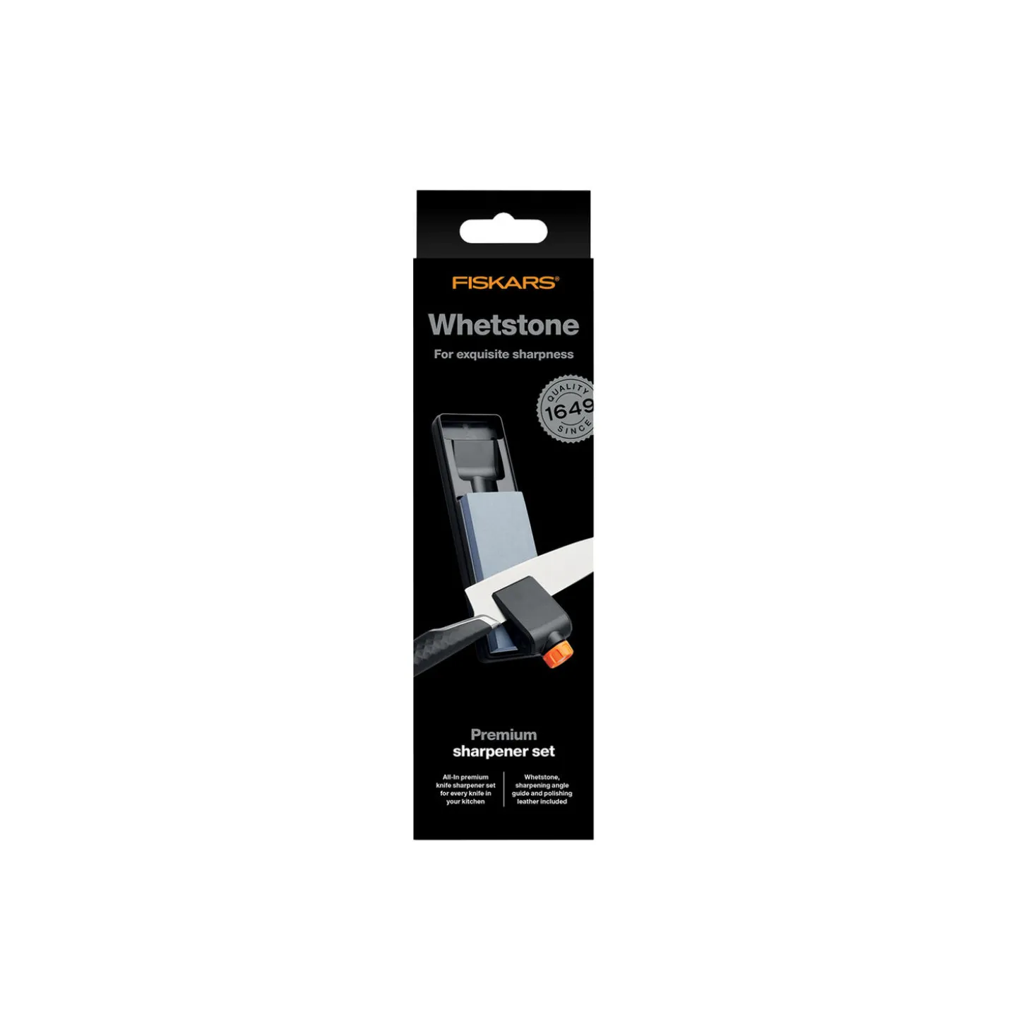 Tilfør nyt liv og ultra-skarphed til alle dine køkkeknive med Fiskars Whetstone Premium knivsliber – et sæt som indeholder slibesten med to forskellige størrelser korn, en holder som sikrer den korrekte slibevinkel samt læder til efterpolering. Alt pakket I sammen i en æske. Denne simple men ekstrem effektive knivsliber kan anvendes til alle Fiskars knive inklusiv Titanium, som kun kan slibes med en slibesten. Æsken indeholder detaljeret brugervejledning omkring sikker slibning.