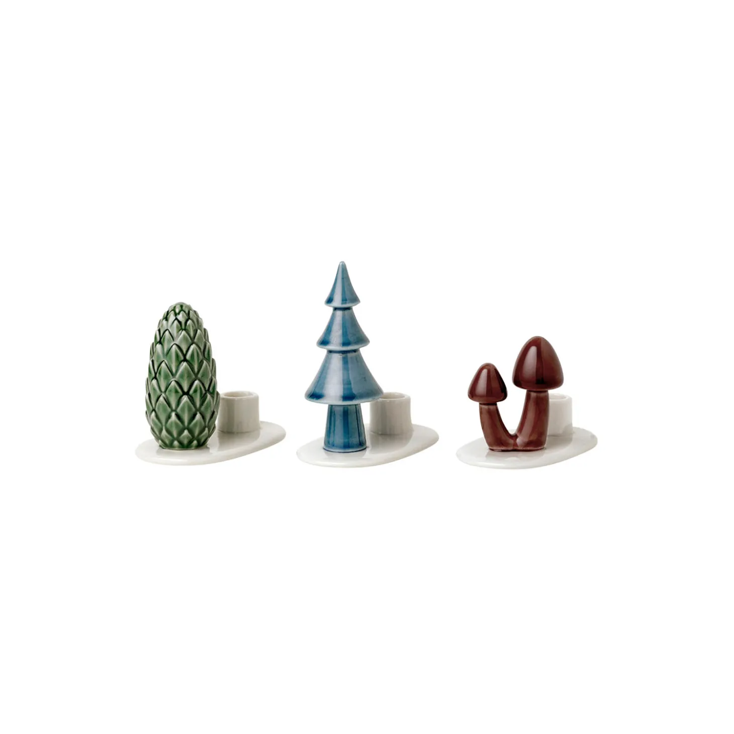 Skab din egen vinterhistorie med 3 lysestager, der passer til et 13 mm lys eller bordkortsholdere. Brug lysestagerne rundt omkring i stuen med et lys, dæk julebordet med flere lysestager fordelt rundt på bordet, eller brug dem ved hver kuvert, enten med et lys eller et bordkort.