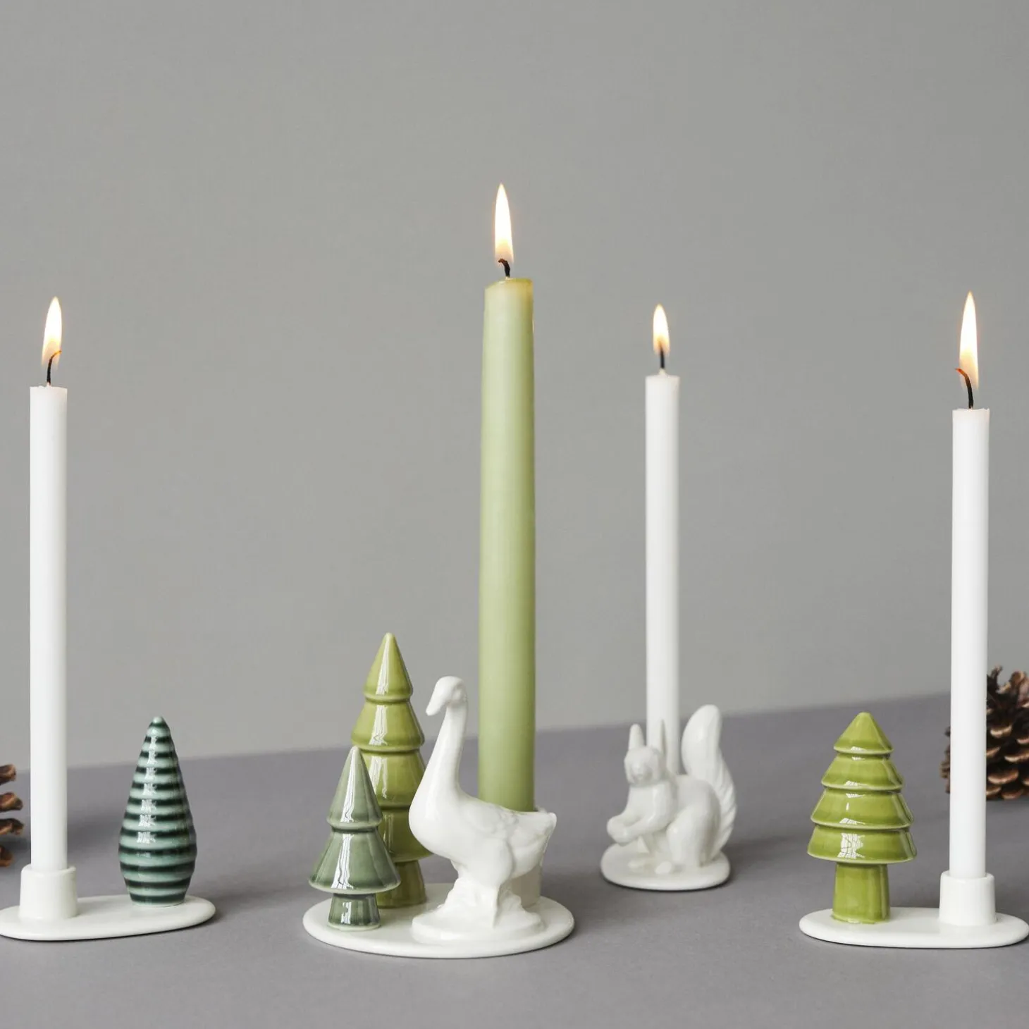 Lysestage med gås. Gåsen er et klassisk julemotiv i Danmark – her med to træer. Winter Stories er små magiske fortællinger om nordens særlige lys og landskab. De bringer varme og hygge til de mørke vinterdage. Beregnet til kronelys.