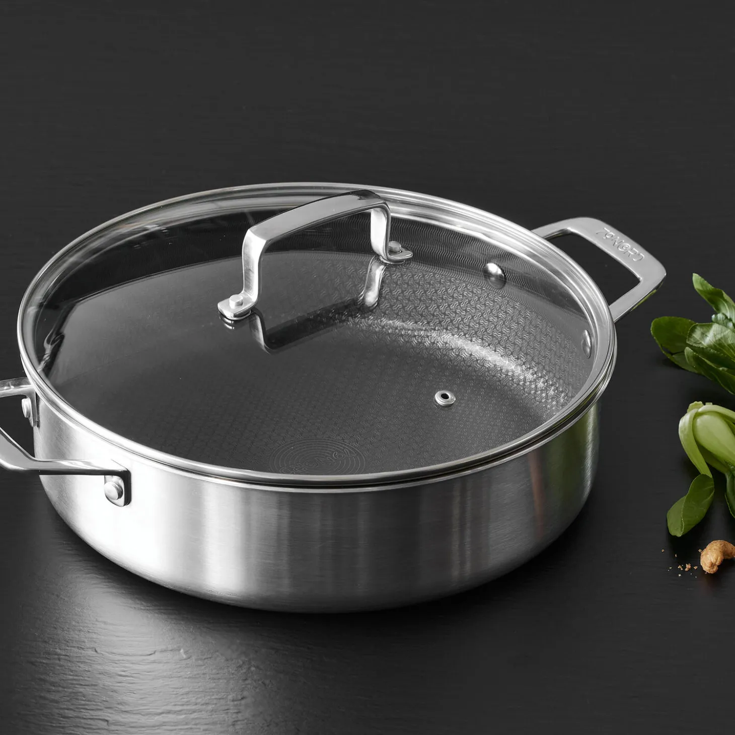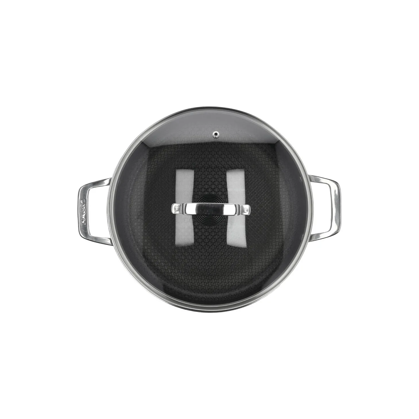 79Nord Hybrid er fremstillet af 3-ply rustfrit stål. Konstruktionen af to lag stål med et aluminiumlag imellem betyder, at varmen fordeles hurtigt og fastholdes jævnt og energieffektivt over både bund og sider, og samtidig er materialet let. Udvendigt er gryder og pander satinpolerede, indvendigt har de en innovativ hybridbelægning. Hybridbelægningen er en kombination af et forhøjet mønster i rustfrit stål og en 2-lags keramisk belægning, produceret uden PFAS. Det forhøjede mønster beskytter belægningen i bunden, og den keramiske topcoating giver non-stick-effekten. Hybridbelægningen er nem at rengøre, og alle typer redskaber kan bruges på belægningen, men vi anbefaler redskaber af træ, plast eller silikone. Inspirationen til mønsteret i hybridbelægningen kommer fra havet omkring øen Mors, fra ringe i vandet, der breder sig hurtigt og ustoppeligt.Håndtag og greb er af støbt stål. Vær opmærksom på, at de kan blive meget varme.79Nord Hybrid-produkterne kan bruges på alle varmekilder, også induktion. De kan desuden anvendes i ovn, med låg op til 200 °C, uden låg helt op til 260 °C. Produkterne er velegnede til vask i opvaskemaskine, og vi anbefaler, at de også vaskes før første brug.