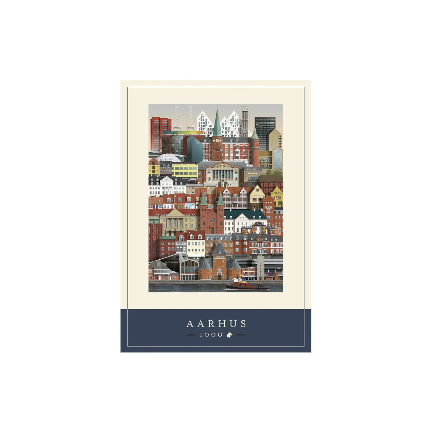 Aarhus puslespil trykt på pap fra Martin Schwartz. Farve: multifarvet. Mål: 50×70 cm. Antal: 1000 brikker.