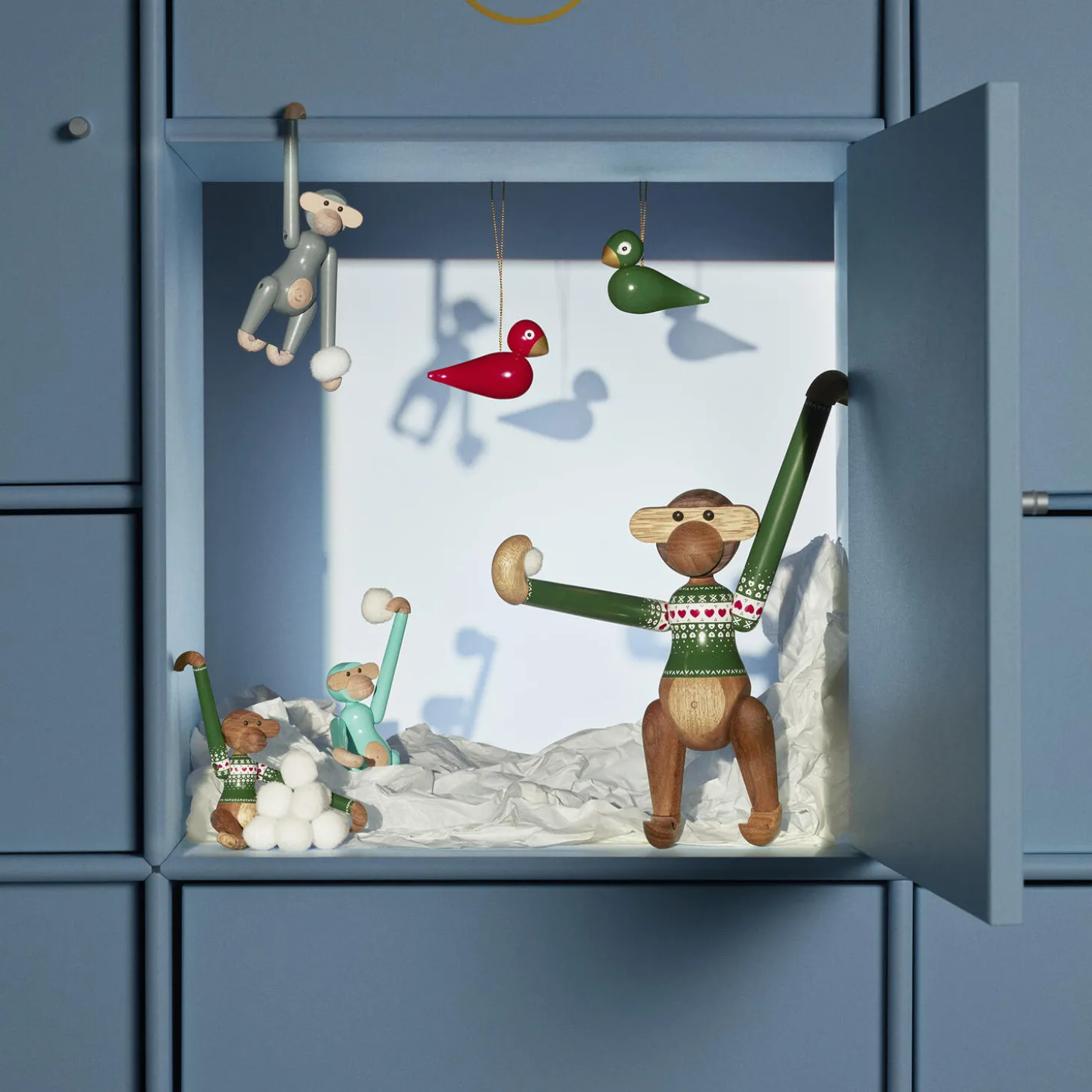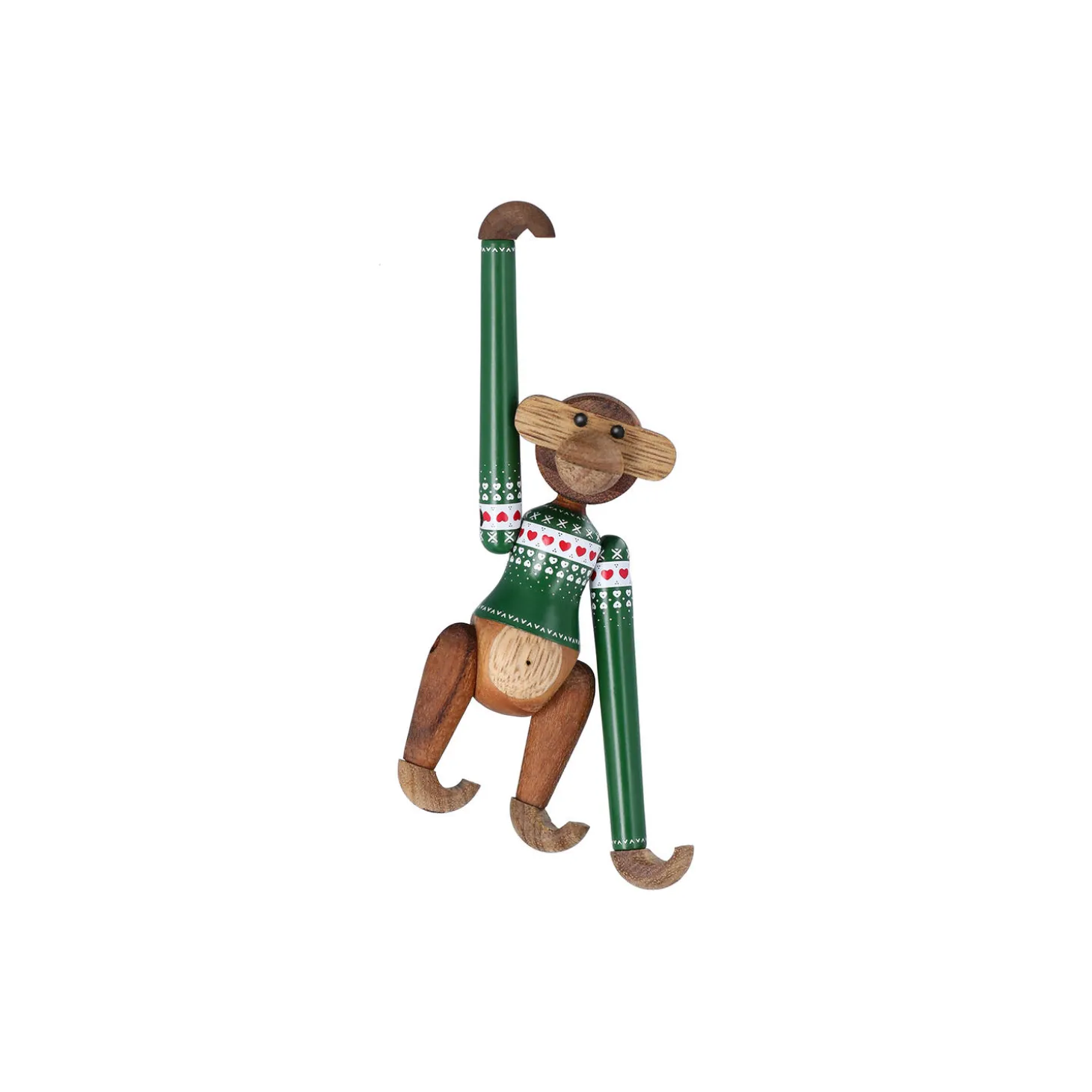 Original julemagi i et flot og moderne snit. Med den altid smilende Kay Bojesen Abe i en unik juleversion iført en flot grøn julesweater væves historien om Kay Bojesens alletiders verdensberømte designikon og vores hyggelige juletid endnu tættere sammen. Kay Bojesen Abe Julesweater 2025 er fremstillet i den velkendte smukt olierede komposition med FSC®-certificeret teak og kontrolleret limba og kommer i både denne miniversion på 9,5 cm og klassiske lille størrelse på 18,5 cm i højden. Begge prydes med et klassisk julemønster med de fineste julehjerter i både rød og hvid på bryst, mave og skuldre – og med en sød lille detalje med et smalt bånd med et dekorativt siksakmønster ved hver ærmekant og i bunden. Trøjens grønne bundfarve er malet med stor omhyggelighed, mens mønsteret i hvid og rød er påført med print med største præcision ned til de mindste detaljer, så julesweateren får det autentiske og gennemarbejdede udtryk fuld af den sjæl og humor, der altid har været udgangspunktet for Kay Bojesens unikke håndværk og historiefortælling. Brugen af de klassiske julefarver og et ikonisk julemønster gør aben selvskreven som et levende og legende element i en moderne indretning i julen, hvor den vil skabe smil og stil med sin finurlige fremtoning og sit farverige udseende – uanset hvor den flytter ind. Kay Bojesen Abe Julesweater 2025 er nostalgisk og nyskabende dansk design, der ydmygt og med et glimt i øjet bygger videre på Kay Bojesens ikoniske designarv og fuld af julesjov tilføjer et nyt kærligt kapitel til hans originale fortællinger i træ siden 1922.