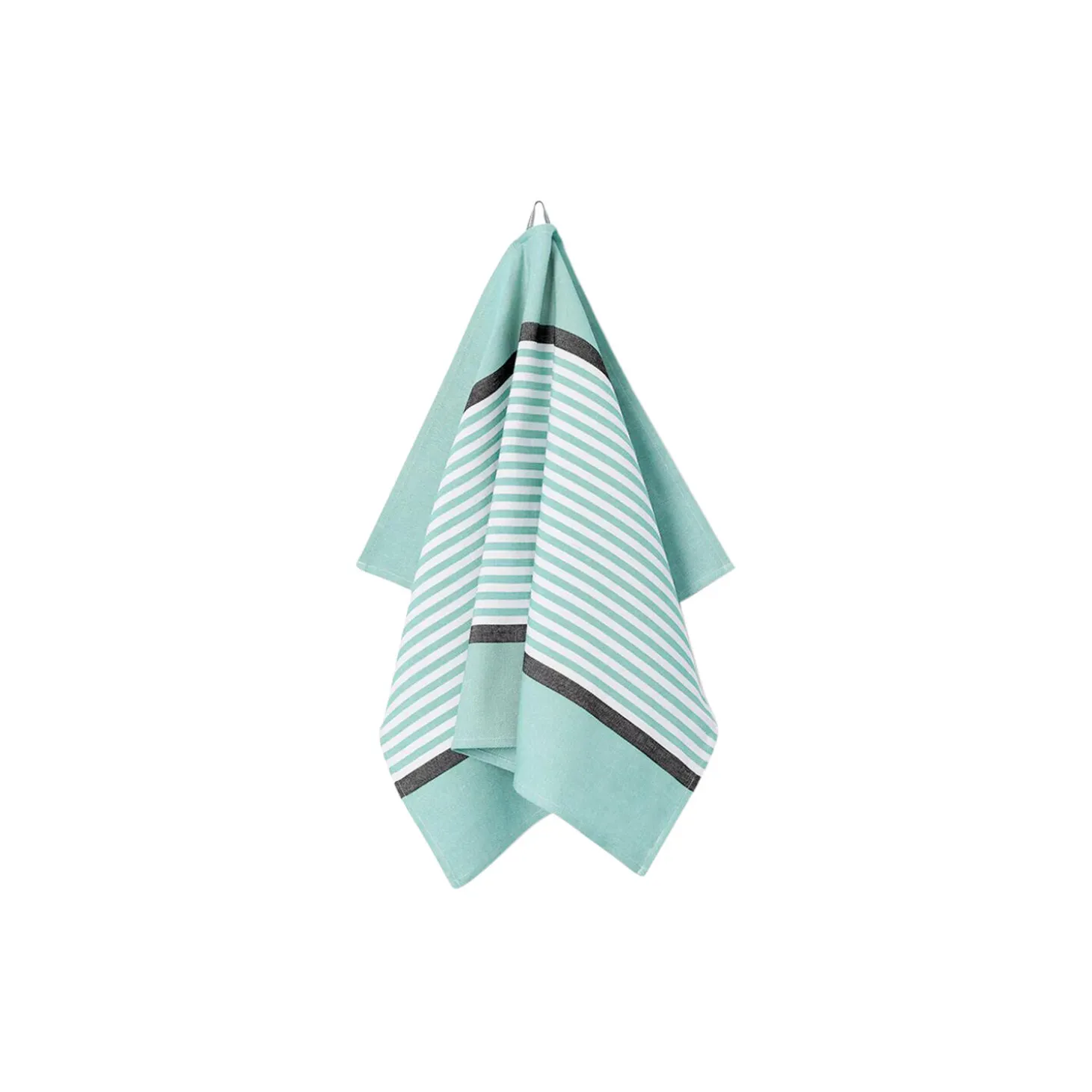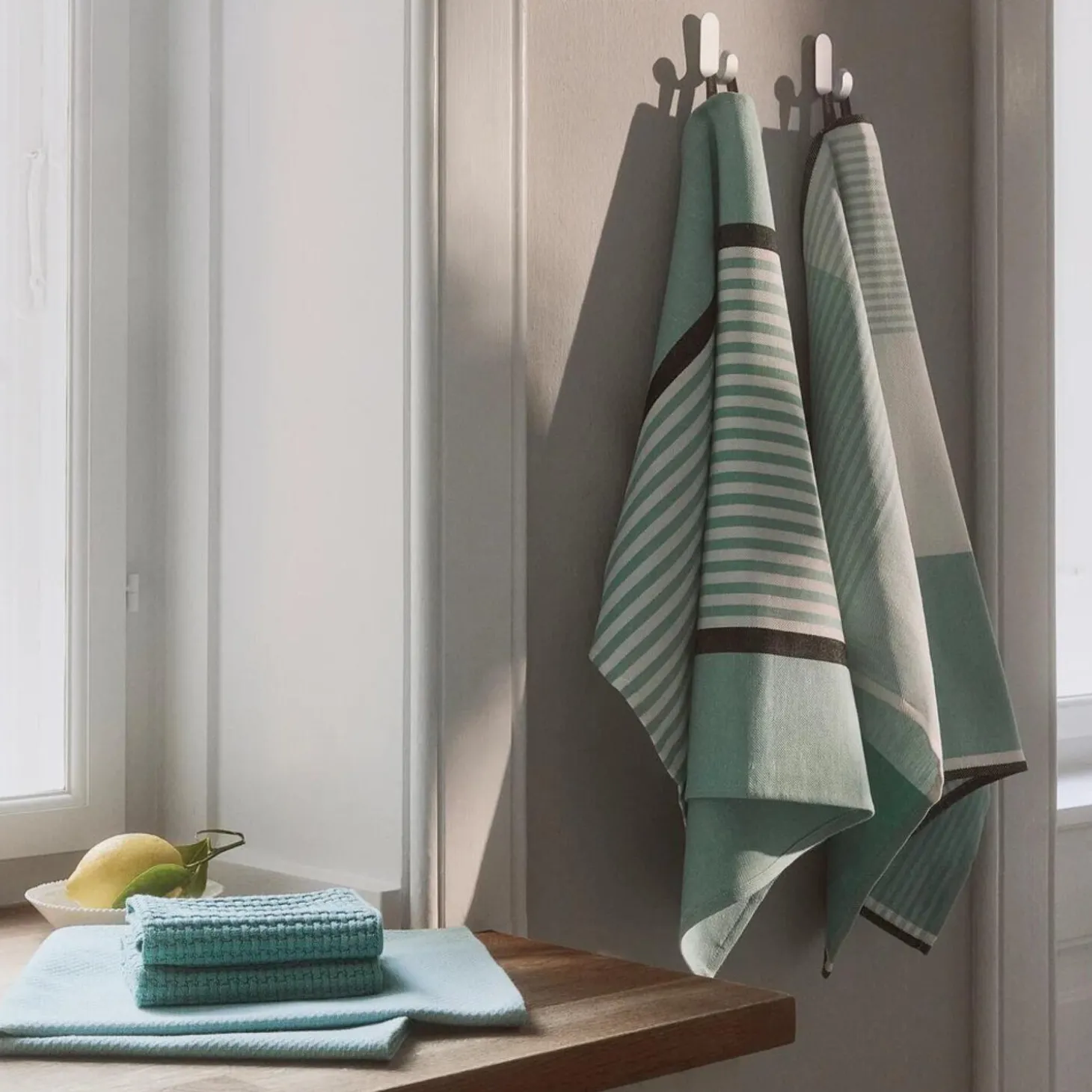 Det stribede Abild viskestykke er en klassiker i Georg Jensen Damasks kollektion. Abild er designet af væver og tekstilingeniør Bent Georg Jensen, som forener kvalitet, funktion og design på elegant vis. Viskestykket er vævet i en kombination af 50 % hør og 50 % bomuld, der giver det optimale tørreegenskaber. Den klare, blågrønne farve, Deep Glass, er inspireret af farven på råglas.