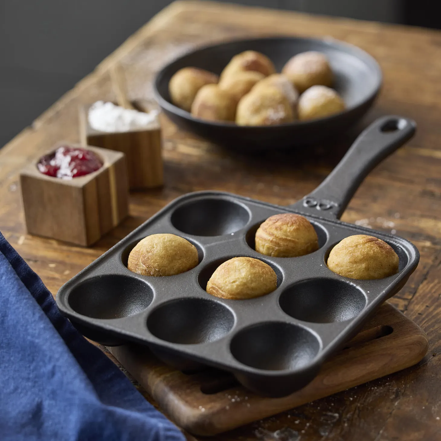 Æbleskivepande m. 9 huller i støbejern. Også god til frække torskedeller, frikadeller, muffins, lasagne on kop & falafel – kun fantasien sætter grænser.33 x 19 x 4,5 cm.