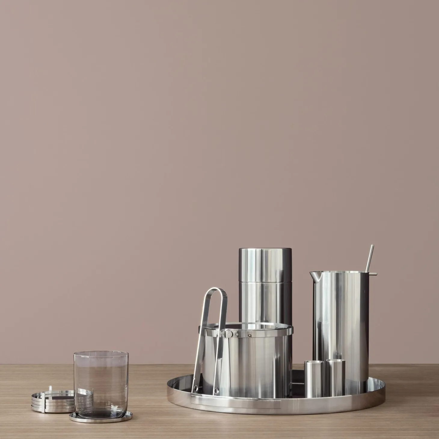 Arne Jacobsens cocktailkande med mixerske gør det let at blande drinkens ingredienser inden servering. Cocktailkanden står smukt på serveringsbakken fra samme designfamilie og er, som resten af cylinda-line serien, udarbejdet i rustfrit stål.