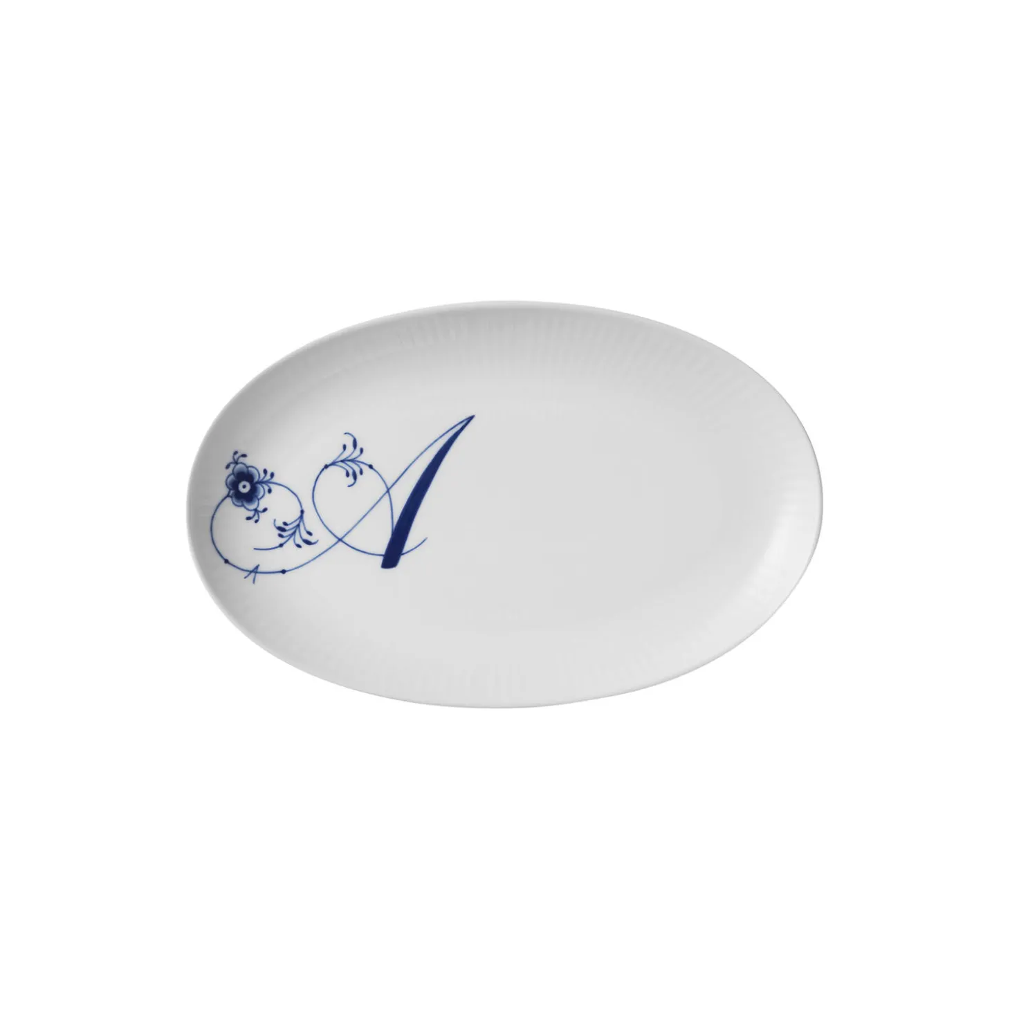Alfabet tallerken A i porcelæn fra Royal Copenhagen. Det smukke ’A’ er håndmalet på denne ovale tallerken på 23,5 cm, som er et charmerende supplement til Alfabetkrusene. Brug den lille tallerken i en personlig opdækning og skab dit eget udtryk ved at kombinere den med andre steldele fra Royal Copenhagen.