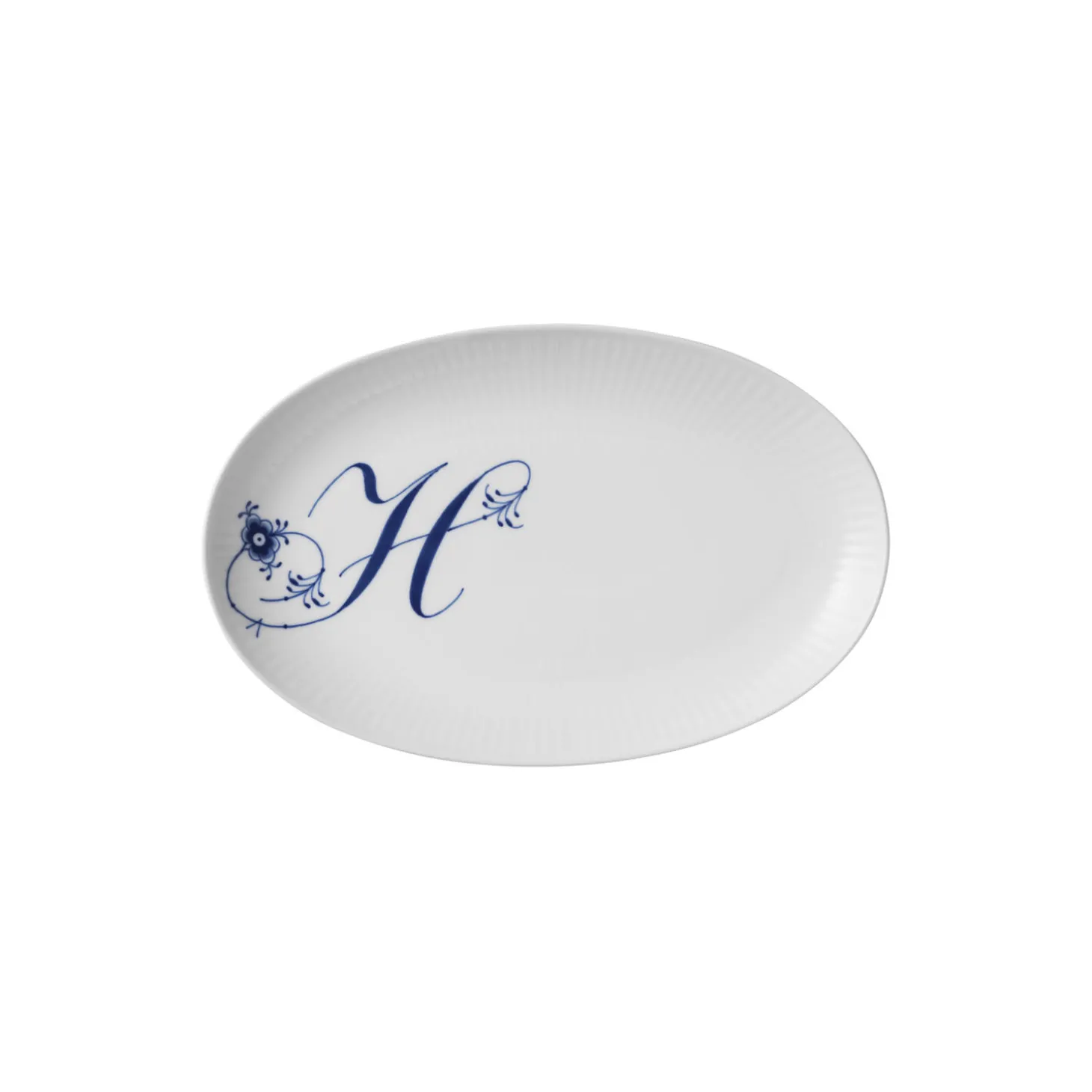 Alfabet tallerken H i porcelæn fra Royal Copenhagen. Det smukke ’H’ er håndmalet på denne ovale tallerken på 23,5 cm, som er et charmerende supplement til Alfabetkrusene. Brug den lille tallerken i en personlig opdækning og skab dit eget udtryk ved at kombinere den med andre steldele fra Royal Copenhagen.