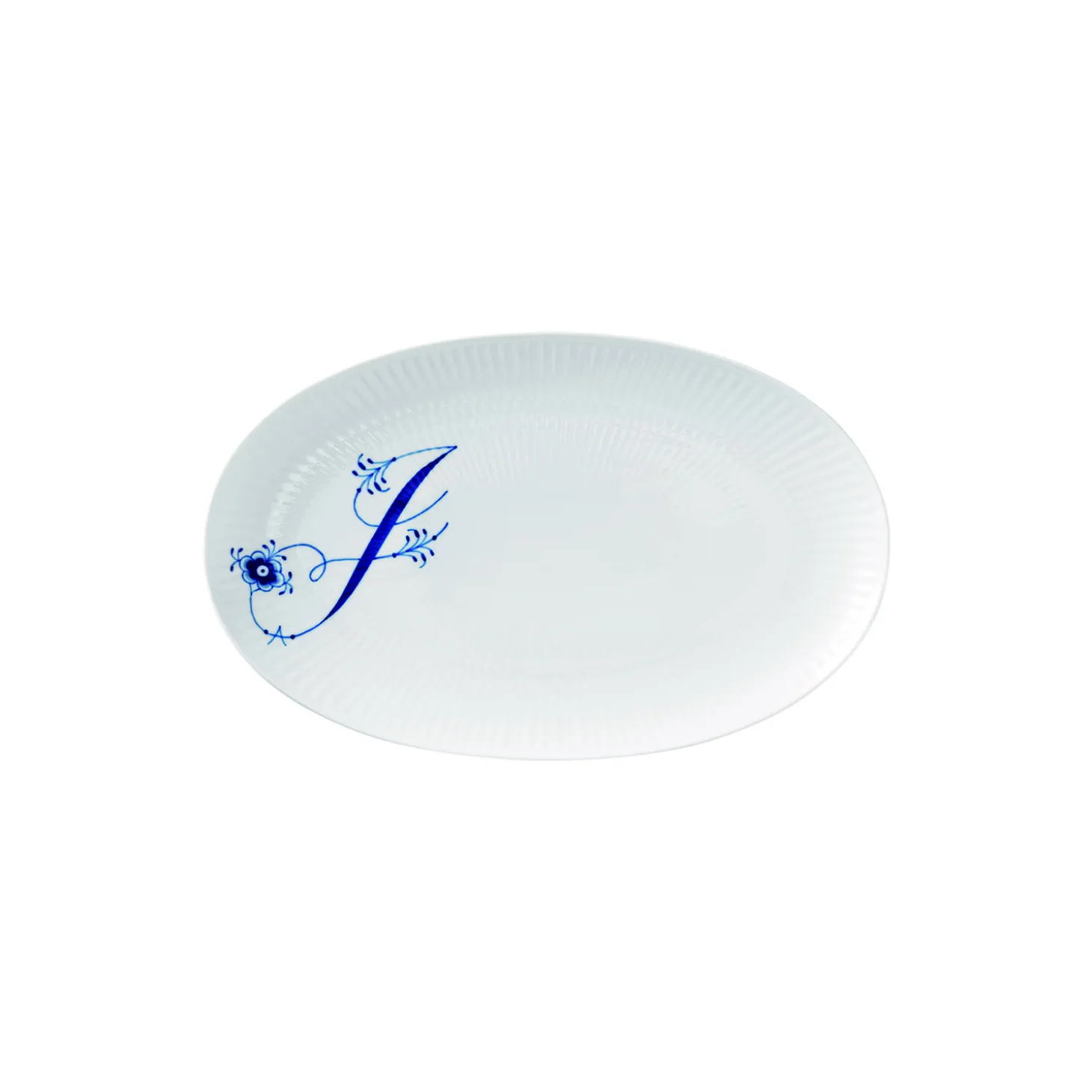 Alfabet tallerken J i porcelæn fra Royal Copenhagen. Det smukke ’J’ er håndmalet på denne ovale tallerken på 23,5 cm, som er et charmerende supplement til Alfabetkrusene. Brug den lille tallerken i en personlig opdækning og skab dit eget udtryk ved at kombinere den med andre steldele fra Royal Copenhagen.