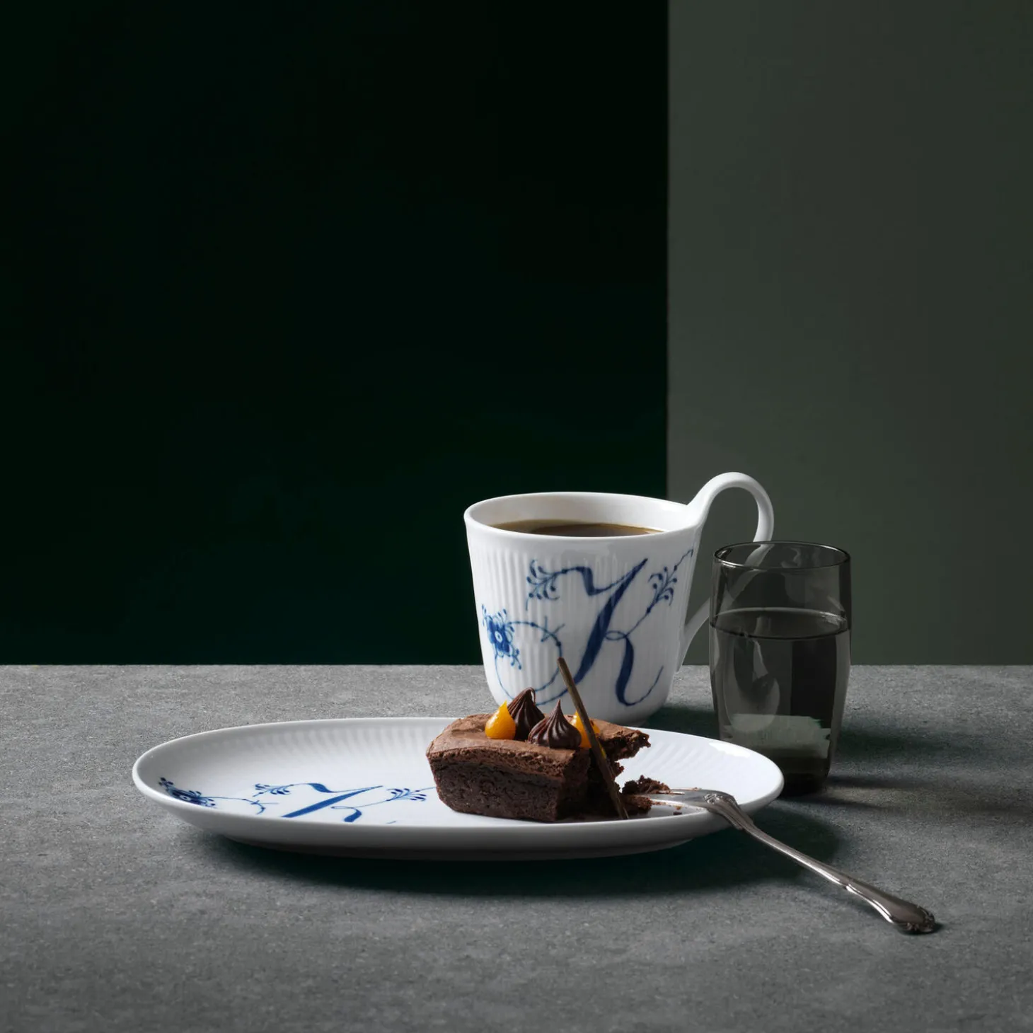 Alfabet tallerken K i porcelæn fra Royal Copenhagen. Det smukke ’K’ er håndmalet på denne ovale tallerken på 23,5 cm, som er et charmerende supplement til Alfabetkrusene. Brug den lille tallerken i en personlig opdækning og skab dit eget udtryk ved at kombinere den med andre steldele fra Royal Copenhagen.