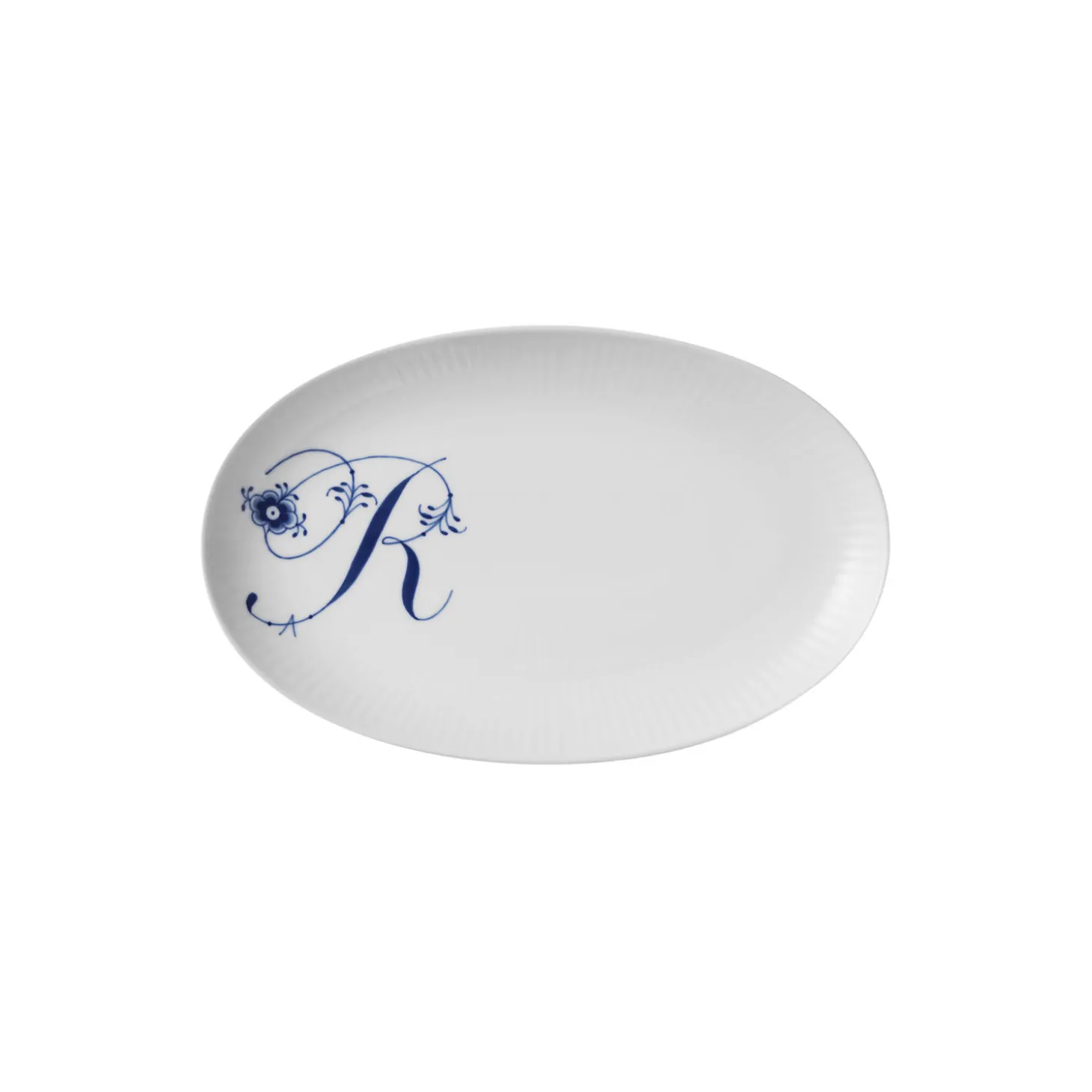 Alfabet tallerken R i porcelæn fra Royal Copenhagen. Det smukke ’R’ er håndmalet på denne ovale tallerken på 23,5 cm, som er et charmerende supplement til Alfabetkrusene. Brug den lille tallerken i en personlig opdækning og skab dit eget udtryk ved at kombinere den med andre steldele fra Royal Copenhagen.