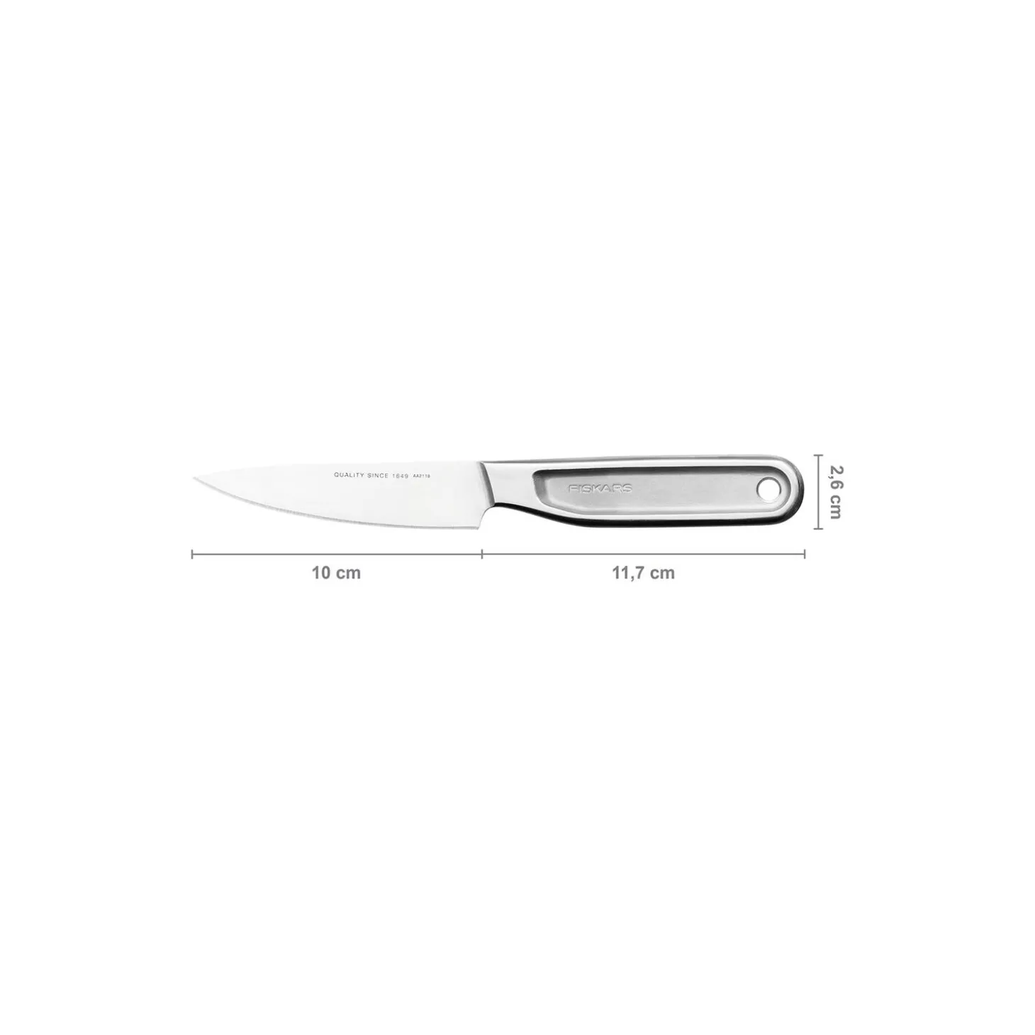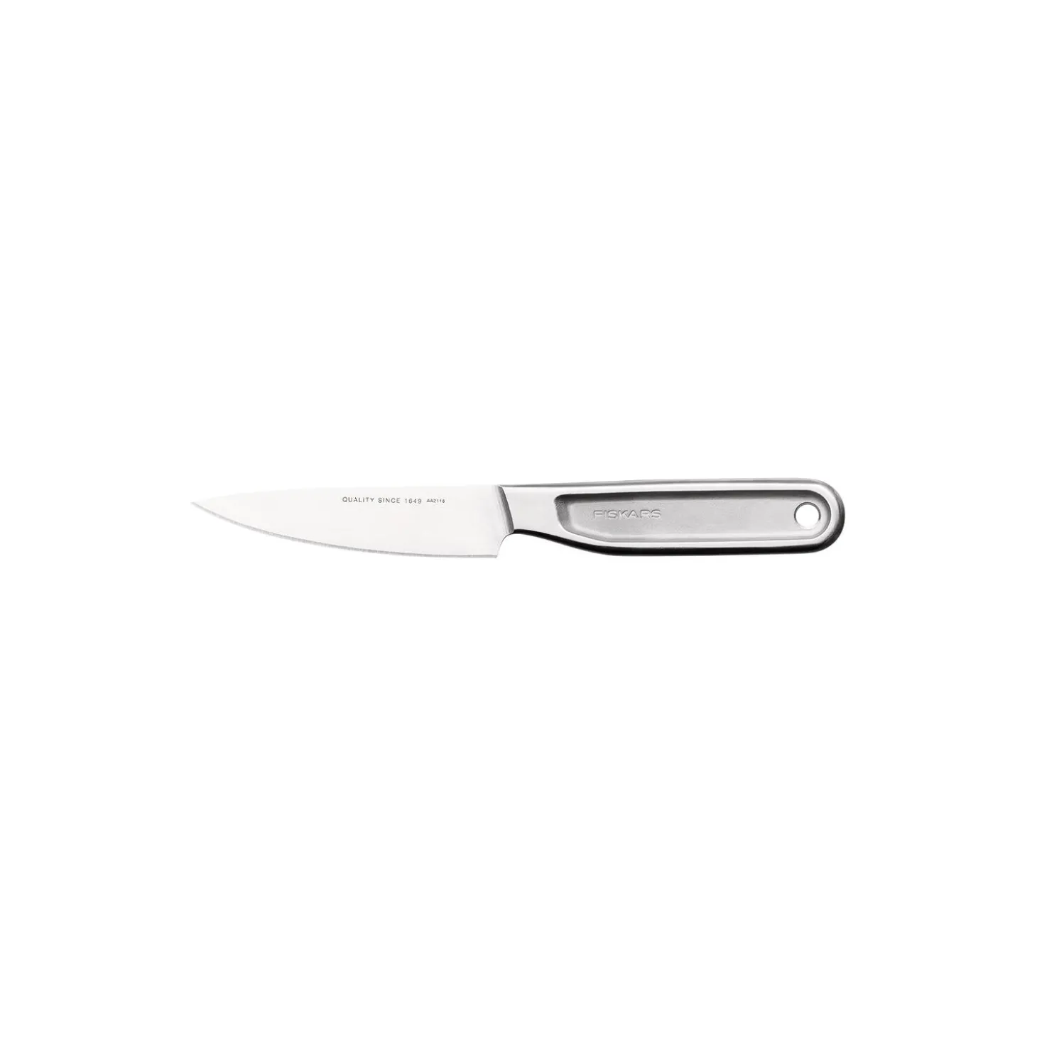 Fiskars All Steel grøntsagskniv er fremstillet af det reneste rustfri stål i høj kvalitet for førsteklasses skæreegenskaber og lang levetid. Grøntsagskniven har et stærkt blad til skrælning og udskæring af frugt og grønt. Japansk stål med et højt kulstofindhold giver fremragende holdbarhed, og det helstøbte design giver kniven et flot tidløst look. Kniven er perfekt afbalanceret, så den ligger naturligt og komfortabelt i hånden, når du skærer. Det anbefales at vaske kniven i hånden. Designet i Finland.