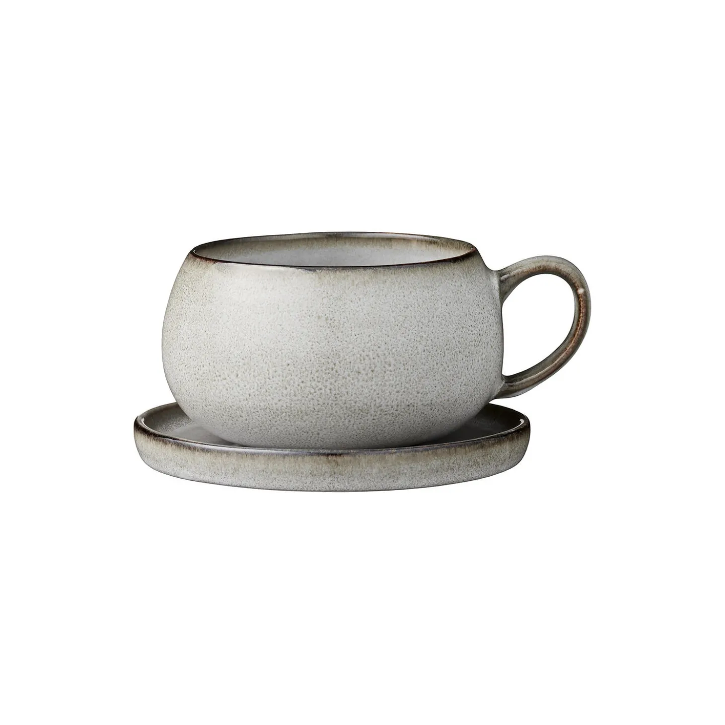 Smuk grå stentøj kop/underkop fra Lene Bjerre. Tilføj et islæt af glæde og skævhed med denne Amera kop/underkop. Med sine rolige farver og bløde organiske former, vil koppen med garanti skabe en hyggelig stemning ved dit bord. Denne kop/underkop er en del af Amera serien. Charmen og kendetegnet for produkterne i Amera serien er, at produkterne er belagt med dobbelt reaktiv glasur. Dette betyder af der kan forekomme variationer i farve og udseende fra produkt til produkt.