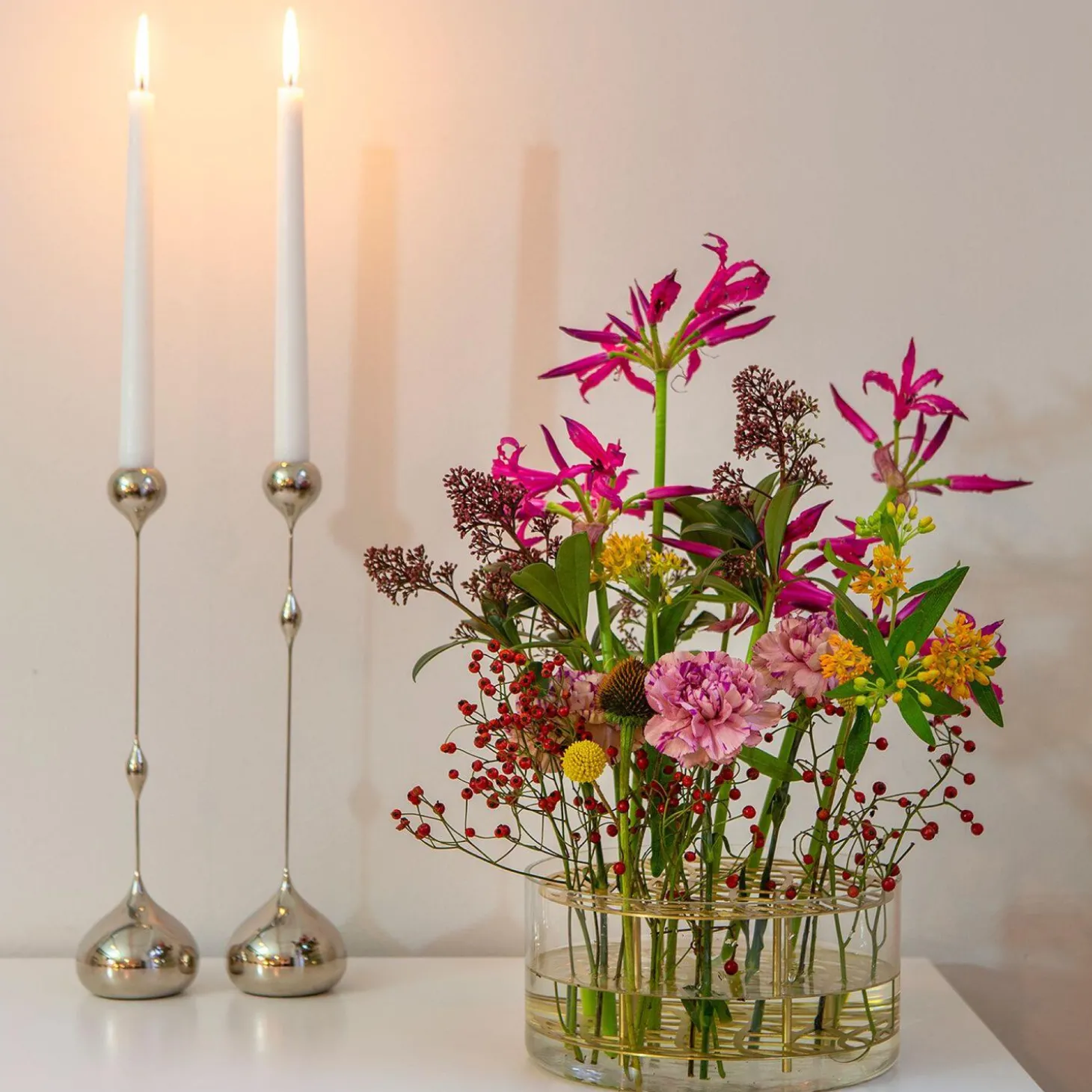 The idea of Äng is to give each individual flower support to stand by itself. The vase has a metal insert with a beautiful pattern, which makes it a piece of art. The structure lets the flowers fall into place and create a nice and organized flower decoration. The vase is mouth blown clear glass from Böhmen, Czech Republic and the insert is available in brass, black, blue/green and silver plated.