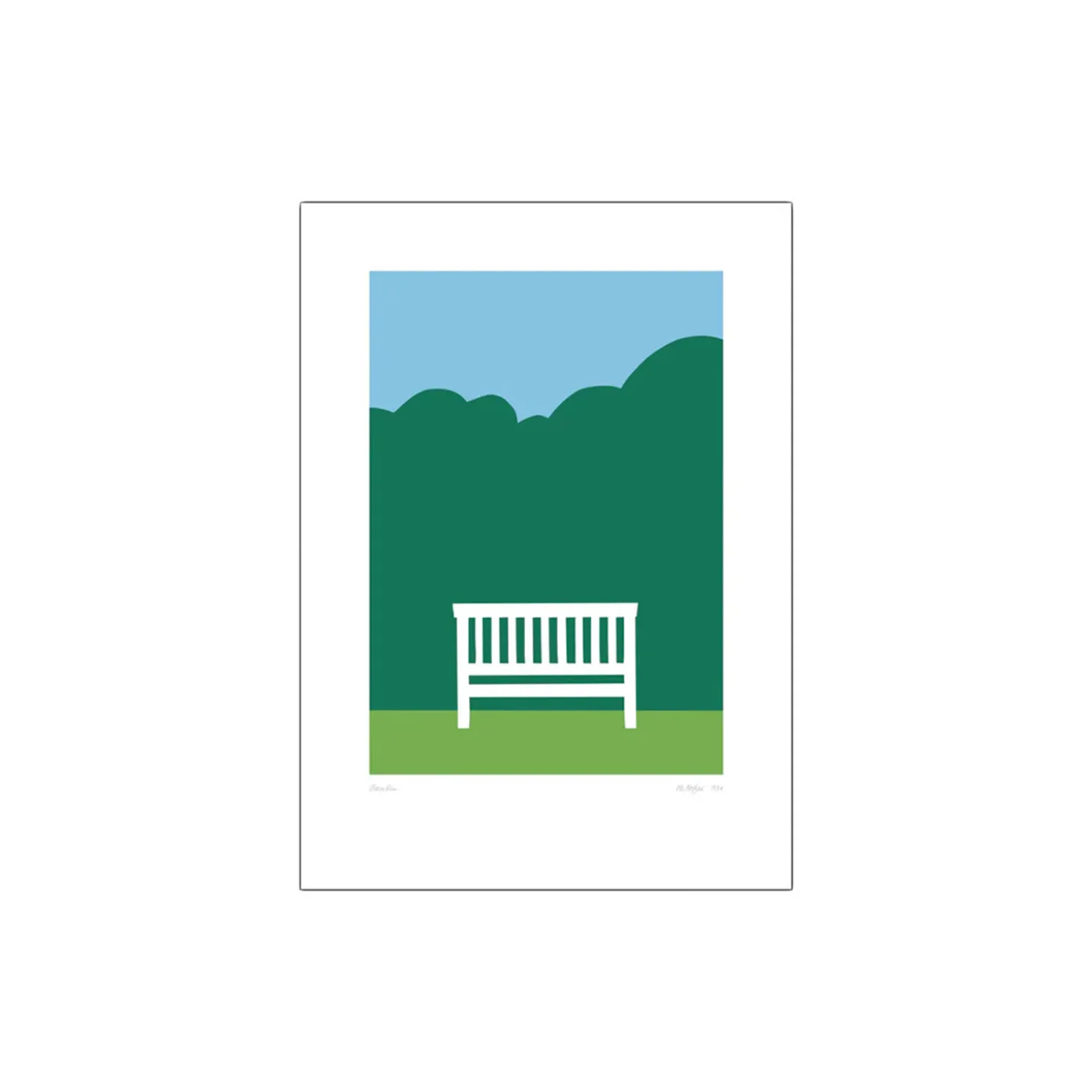 Kunstplakaten er en reproduktion af det originale kunstværk Bænken, som blev serigrafitrykt i 1974. Havebænken.