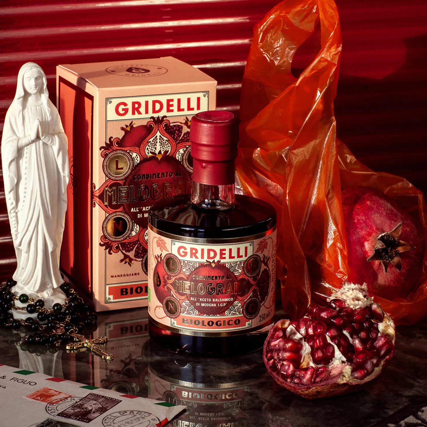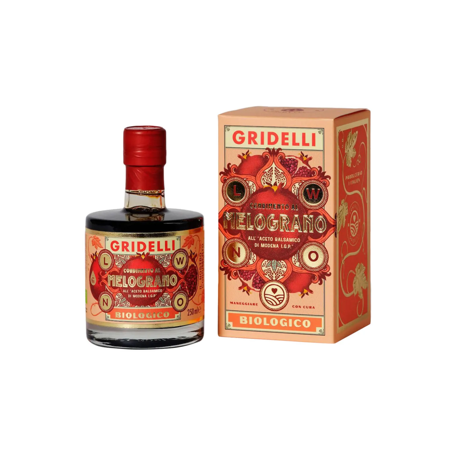 Økologiske druer fra området Emilia-Romagna. Indeholder 95,8 % I.G.P.-klassificeret balsamicoeddike fra Modena, 4 % økologisk granatæblejuice og 0,2 % naturlige smagsstoffer. Passer perfekt sammen med olivenolie for at forbedre en salat. Fantastisk alene med et ostefad eller dessert og en uventet smagsfornemmelse til at blande forfriskende drinks. Gridelli Aceto Balsamico al Melograno er blevet tildelt guld i Swedish Design Prize emballagekonkurrence 2021 og sølv i World Brand Design Society 2021.