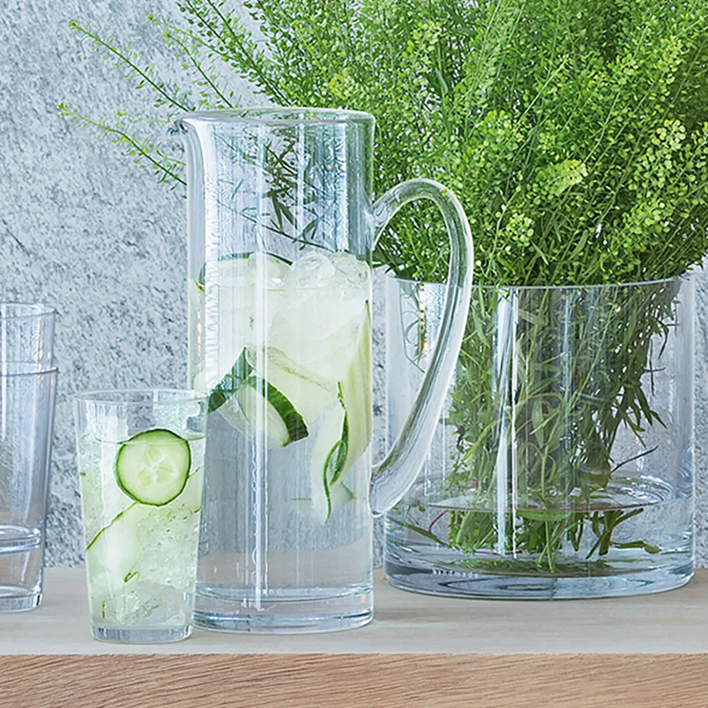 Høje slank kanden i mundblæst glas med en moderne cylindrisk form og vægtig bund. Kanten er sakseklippet og tuden formes i hånden ved hjælp af et træværktøj. Håndtaget i klar glas formes, og påføres i hånden på kandens krop.