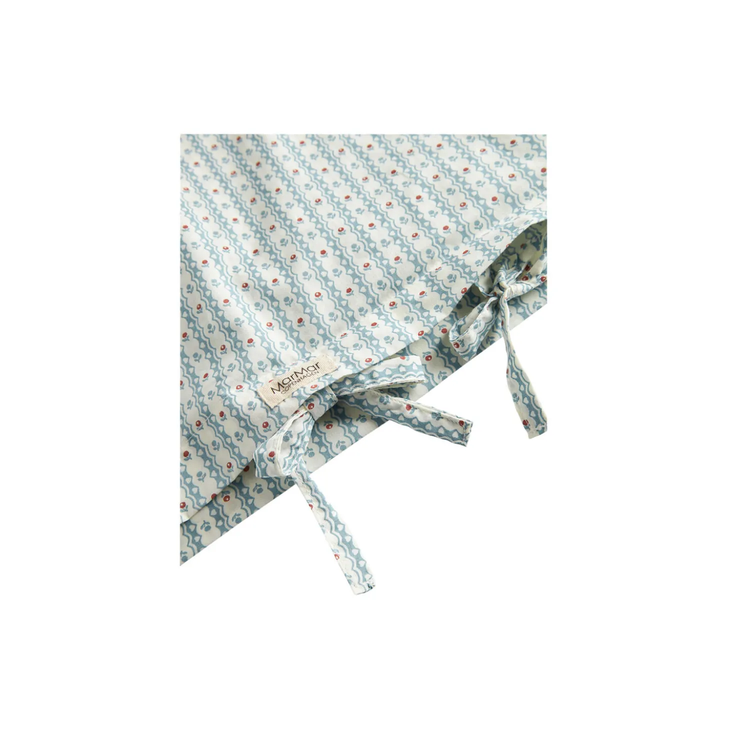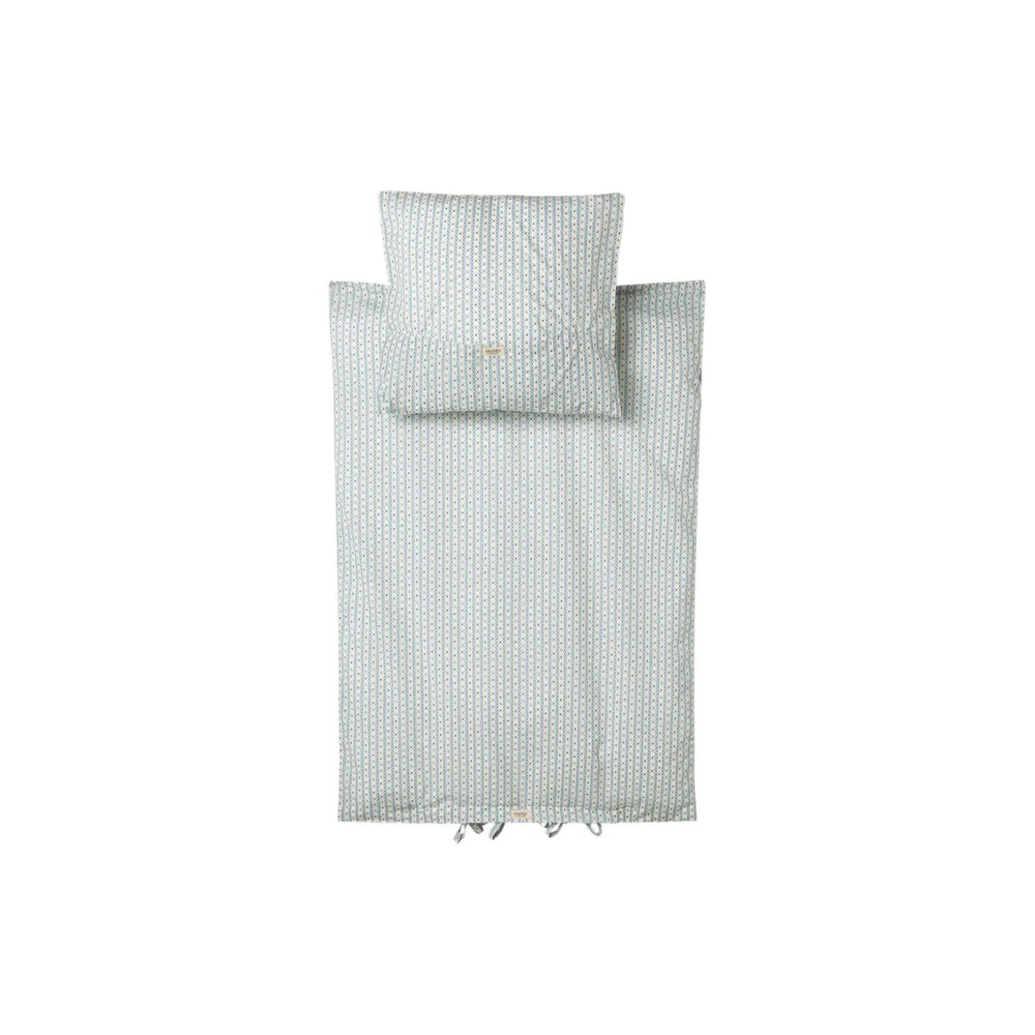 Junior sengetøj med betræk til dyne og hovedpude. Dynebetrækket lukkes med bindebånd i fodenden.