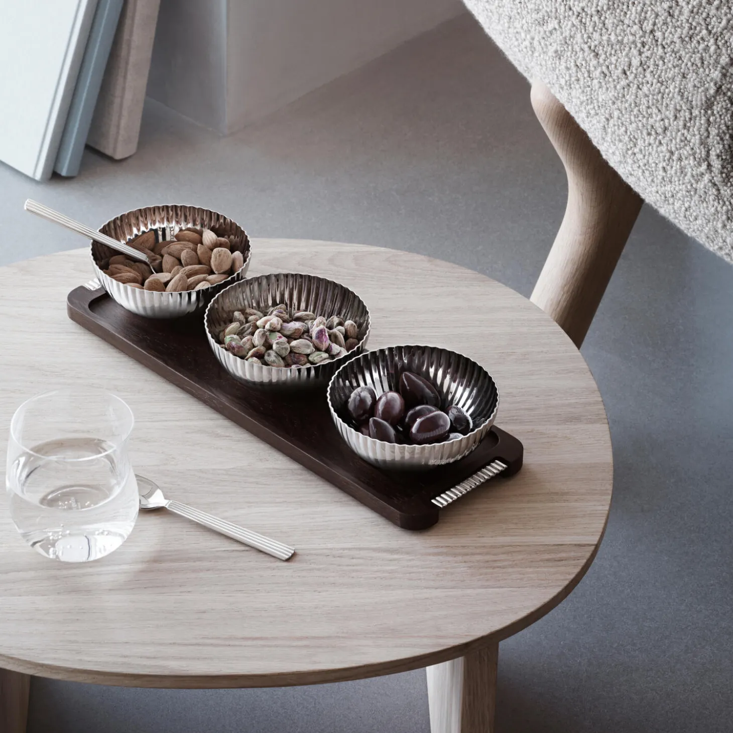 Det hele ligger i detaljen! Servér snacks, bær eller slik i de dekorative skåle i rustfrit stål fra Bernadotte kollektionen. Brug også bakken og skålene hver for sig for skabe dit eget personlige udtryk i indretningen. De små skåle er udsmykket med de ikoniske Art-Deco inspirerede riller, der udsmykker mange af Sigvard Bernadottes designs.