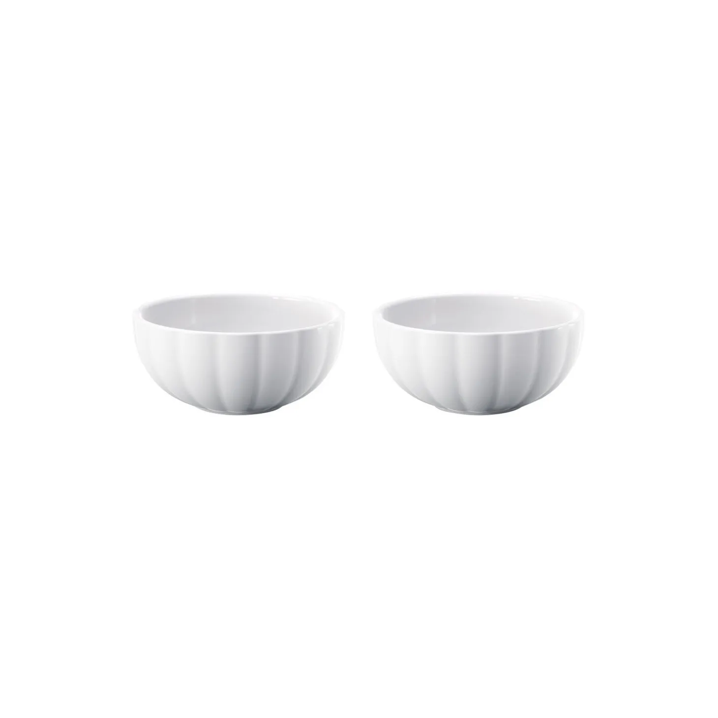 Den riflede overflade i disse små porcelænsskåle henter inspiration fra Sigvard Bernadottes velkendte design for Georg Jensen. De små, hvide skåle er ideelle til marmelade, soya og andre former for tilbehør. Dette sæt består af to skåle. Skålene egner sig til opvaskemaskine.