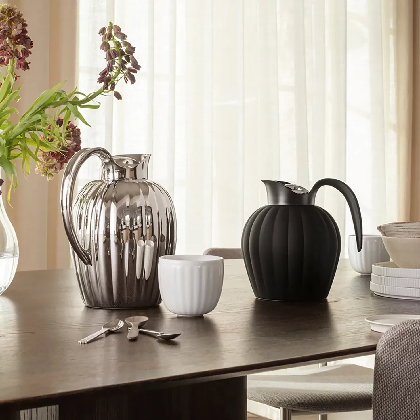 Den ikoniske Bernadotte termokande er nyfortolket i denne særudgave af det klassiske design. Signaturformen og det riflede design er bevaret i termokanden, som her kommer i en elegant, sort version. Termokanden har en robust inderside i rustfrit stål, som hjælper med at holde drikken varm eller kold i længere tid. Låget er fremstillet af blankt rustfrit stål og har en praktisk knap, så det ikke skal skrues af, når der hældes fra termokanden.