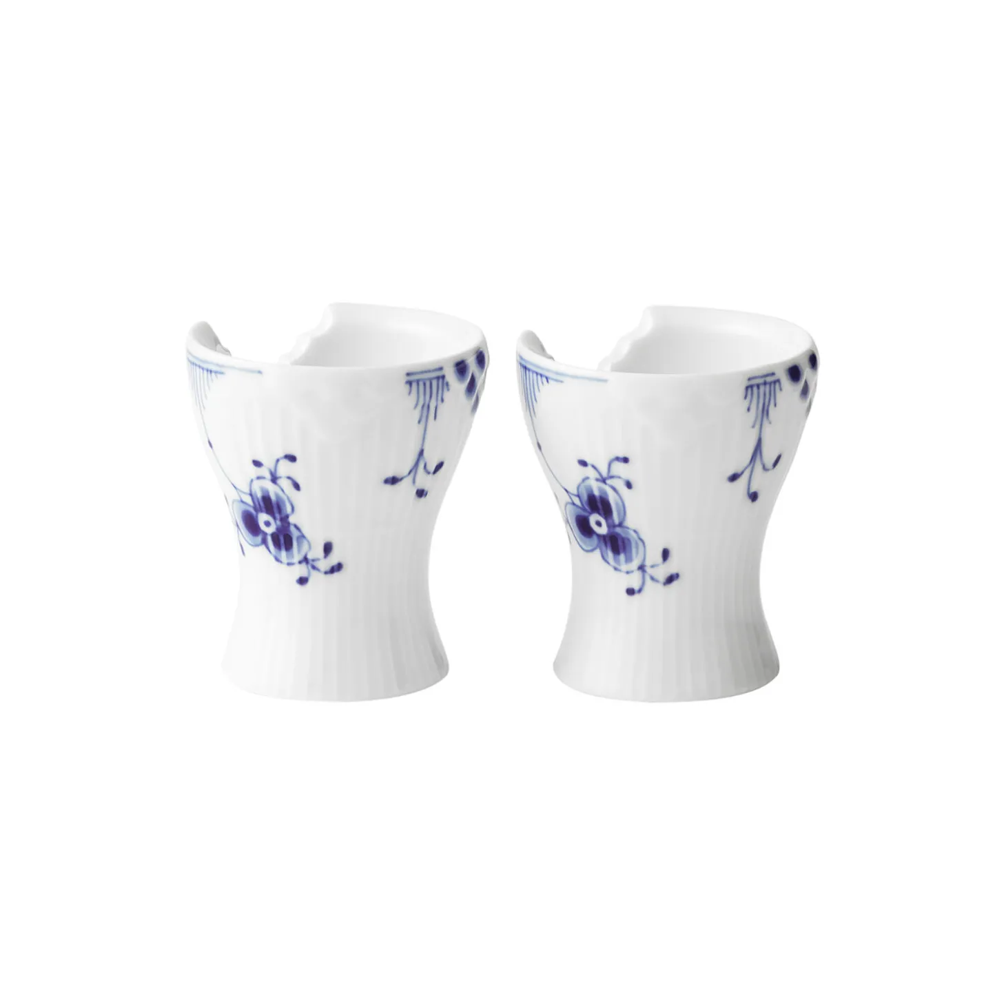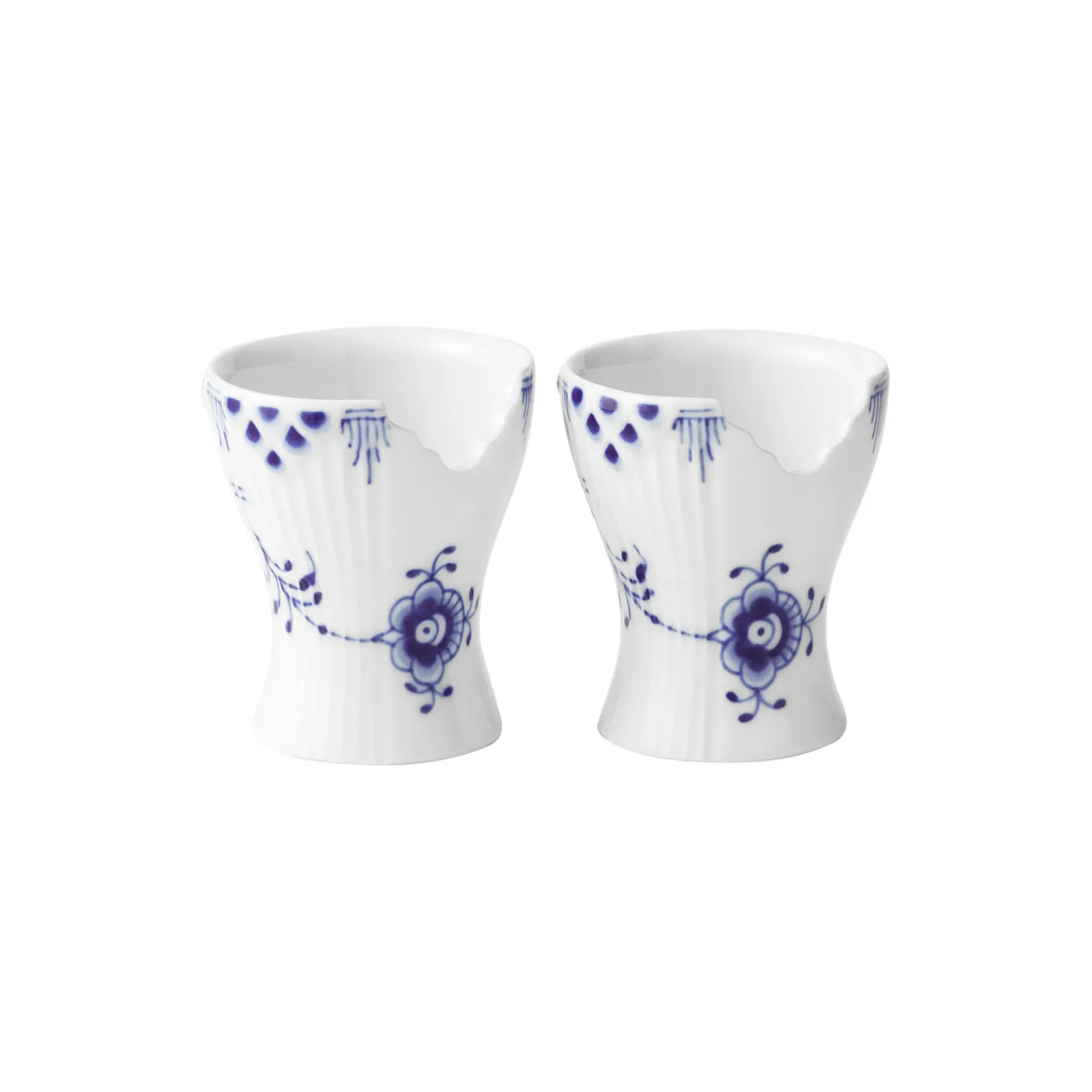 Blå Elements æggebæger i porcelæn fra Royal Copenhagen. Sættet med to Blå Elements Æggebægre på 5,5 cm fremstår i et uhøjtideligt formsprog, der gentænker klassiske elementer fra Royal Copenhagen i en nytænkende sammensætning. En delikat silhuet af en udskåret fiskeskælsdekoration skaber en unik kant på æggebægrene, der er håndmalede i et legende mønster af florale elementer på det riflede porcelæn.