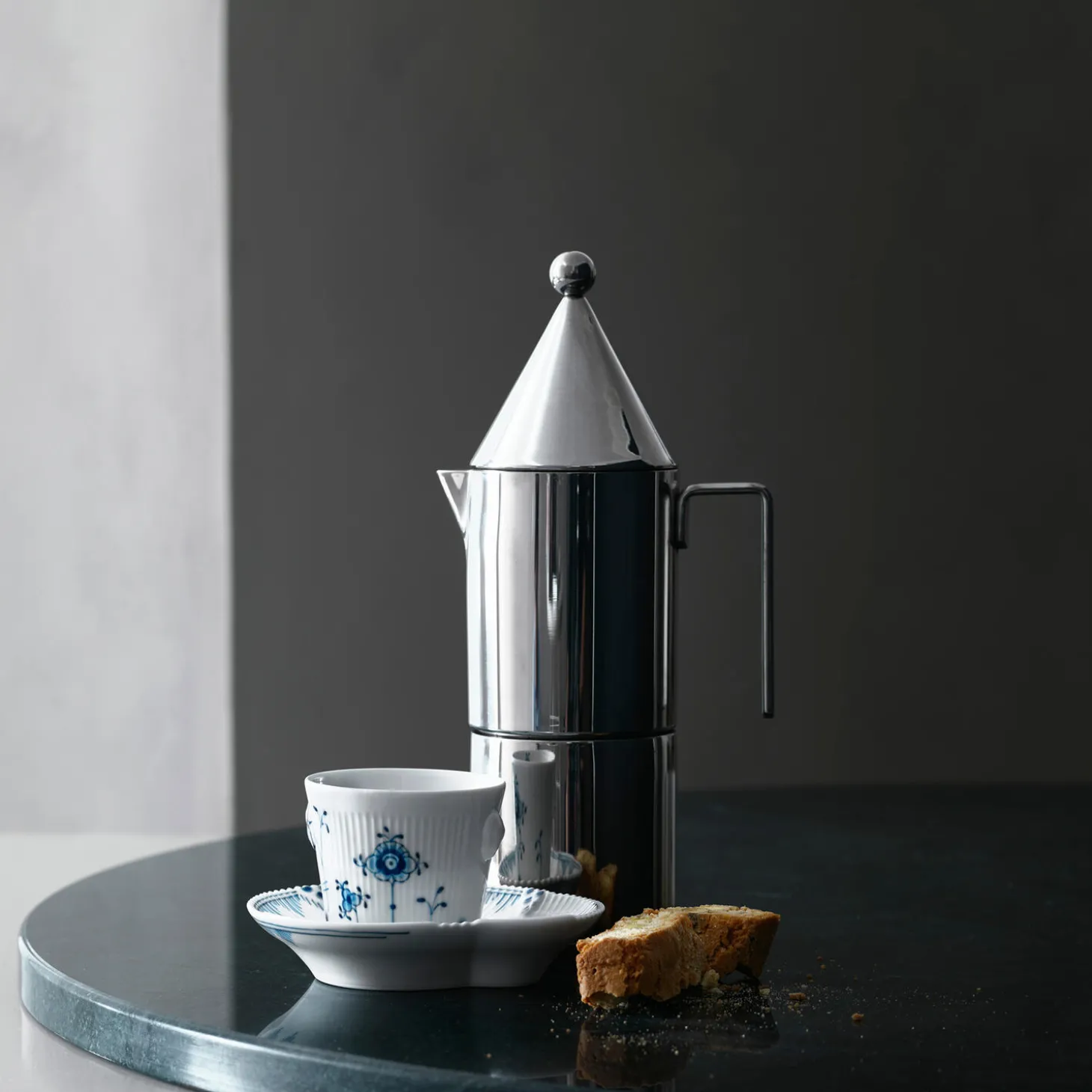 Blå Elements espressokop med underkop i porcelæn fra Royal Copenhagen. Denne udtryksfulde Espressokop og underkop på 9 cl i Blå Elements har et organisk design, som komplimenteres af håndmalede elementer, som er placeret i et legende mønster på det hvide porcelæn. På siderne af koppen sidder to kantblomster, hvoraf den ene er dekoreret med blå penselstrøg, mens underkoppen er holdt i blå fiskeskælsdekorationer og stringente linjer, der understreger den takkede kant inspireret af Flora Danica-stellet. Skab et uhøjtideligt morgenbord med flere dele fra Blå Elements eller kombiner espressokoppen med klassiske steldele i et personligt udtryk.
