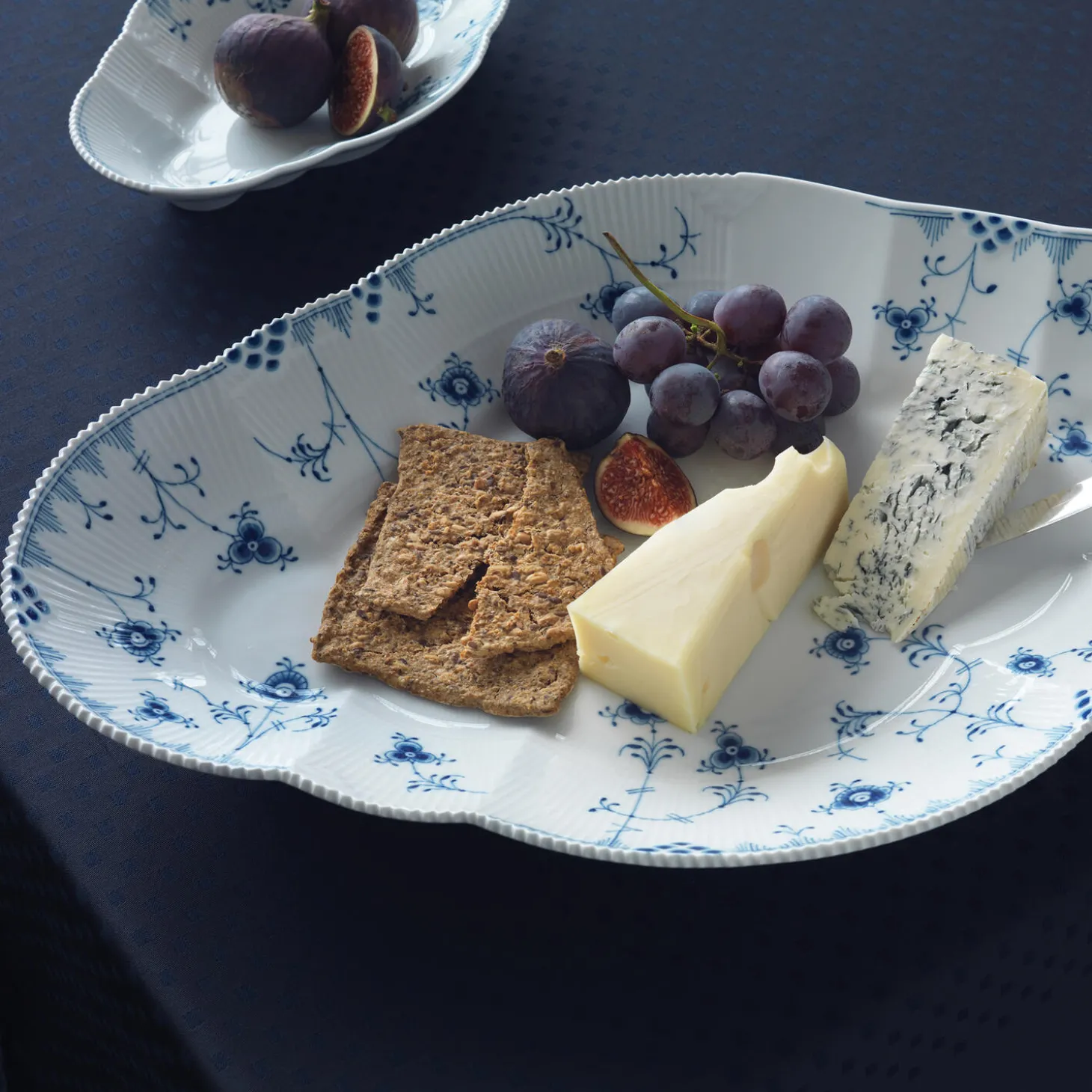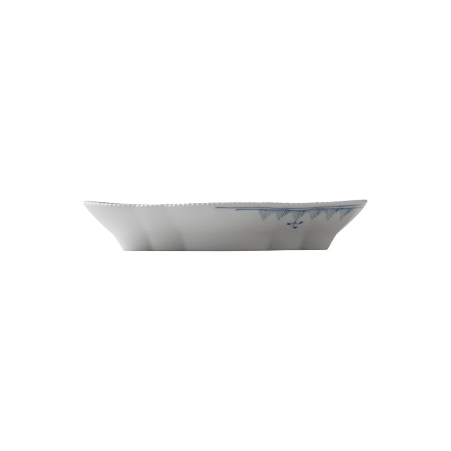 Blå Elements fad i porcelæn fra Royal Copenhagen. Det ovale Blå Elements Fad på 23 cm charmerer med sit særlige formsprog, der er skabt af en legende kombination af ikoniske elementer fra Royal Copenhagens klassiske stel. Det håndmalede mønster komplimenterer den særlige sammensætning af rifler og fiskeskælsdekorationer, mens delikate takker på kanten af fadet udtrykker en smuk elegance i enhver borddækning. Det smukke fad kan, udover at bruges til servering af tilbehør, også fungere som en dyb tallerken til kreative anretninger af forretter og desserter.