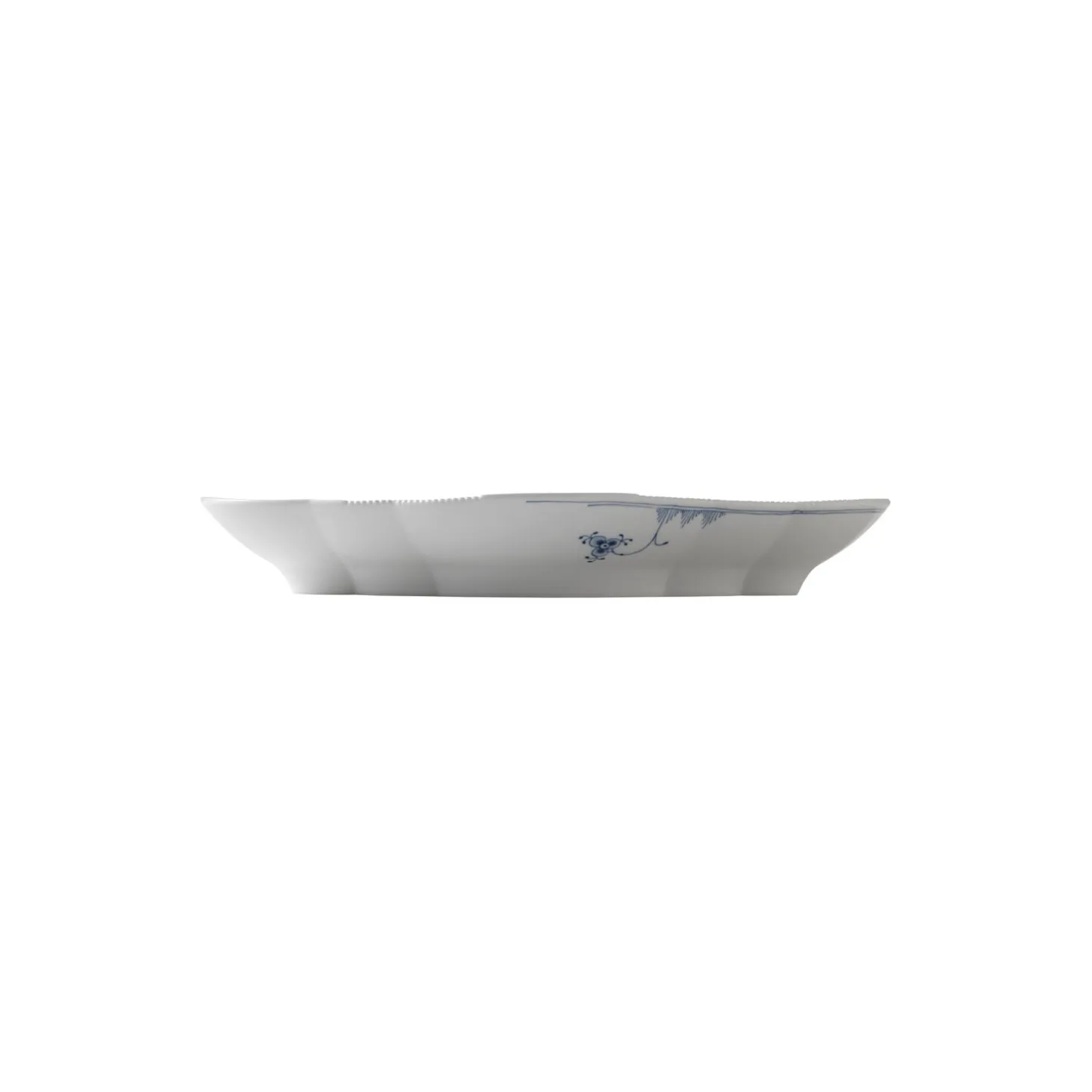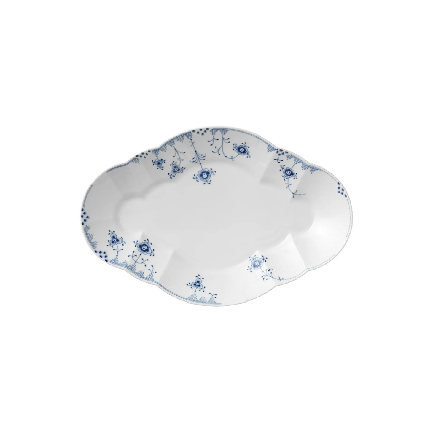Blå Elements fad i porcelæn fra Royal Copenhagen. Set fra siden er Blå Elements Fad på 38,5 cm skabt i klassiske, organiske former, men ved nærmere syn består fadet af elementer, der er skilt ad og sat sammen på ny i et uhøjtideligt og nytænkende formsprog. Fadet prydes af et håndmalet mønster med klassiske, florale elementer, der dog fremstår i et legende udtryk, som snor sig langs taktile rifler og den takkede kant fra det ekstravagante Flora Danica. Fadet er nyttigt til serveringer af enhver ret på det veldækkede bord.