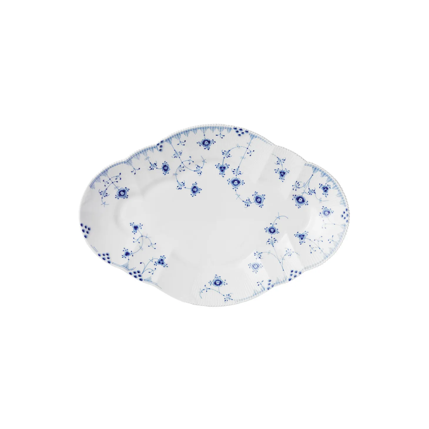 Dette store fad på 49 cm i det livlige Blå Elements-mønster overrasker med sin uhøjtidelige sammensætning af klassiske elementer. Taktile rifler er sat sammen i assymetriske brudstykker, der prydes af subtile fiskeskælsdekorationer og Flora Danicas delikate, takkede kant, mens den ovale form på fadet skaber et balanceret udtryk. Det håndmalede mønster snor sig legende rundt på det hvide porcelæn i en nytænkning af den klassiske æstetik, der kan skabe en iøjefaldende borddækning i ethvert hjem. Blå Elements blomstrer i glædefyldt elegance med en inspirerende sammensætning af klassiske Royal Copenhagen designelementer og håndmalede dekorationer, der får lov at vokse frit på porcelænets overflader. Ligesom Hvid Elements og Multifarvet Elements er Blå Elements smuk i sig selv eller i kombination med andre stel fra Royal Copenhagen for et udtryk af legende, nutidig skønhed.