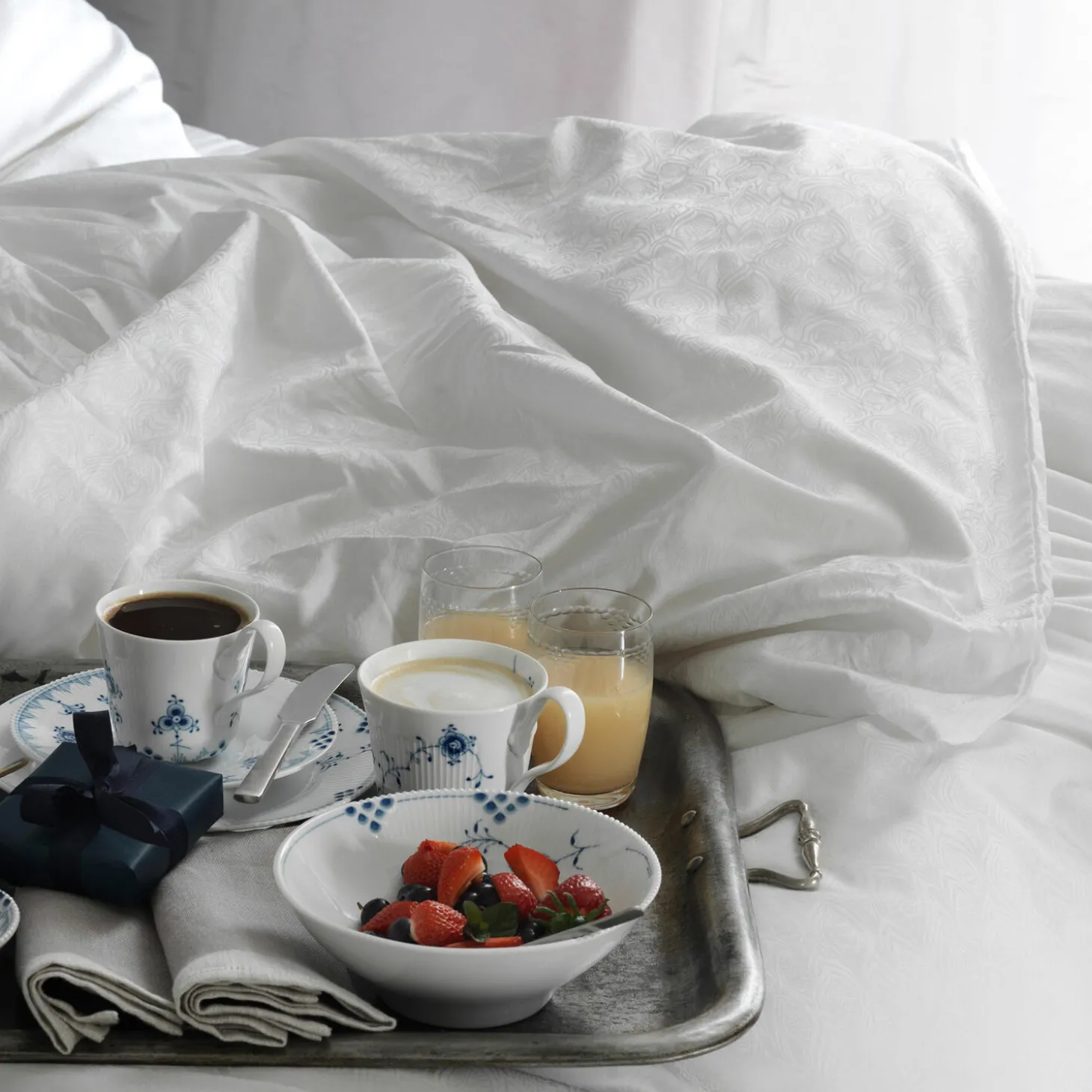 Blå Elements højhankskop og underkop i porcelæn fra Royal Copenhagen. Denne Blå Elements Højhankskop og underkop på 24 cl fremstår med smukke blomster og palmetter, der breder sig ud over steldelen i et legende, håndmalet mønster. Underkoppen med de delikate takker langs kanten står på en lav søjlefod, som synes at få koppen til at svæve over bordet i en uhøjtidelig elegance, der kan indgå i enhver borddækning.