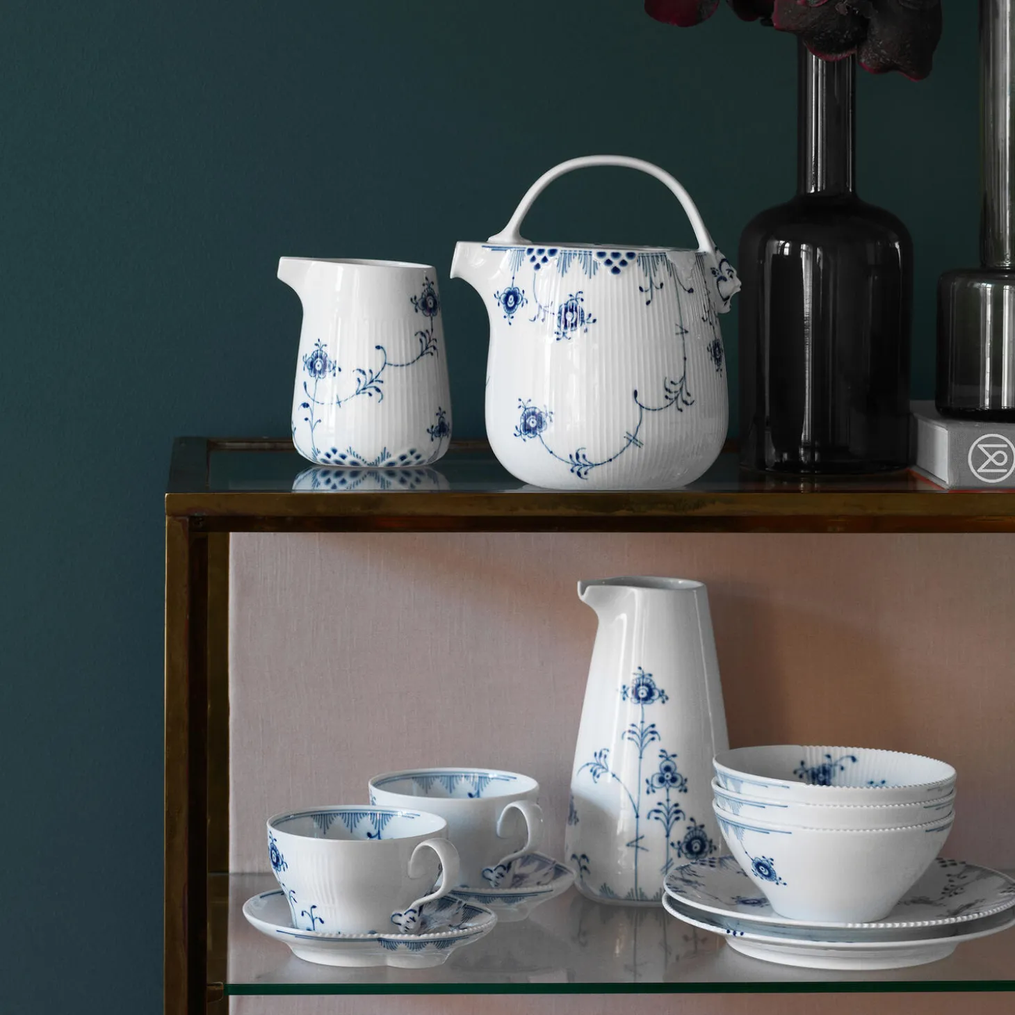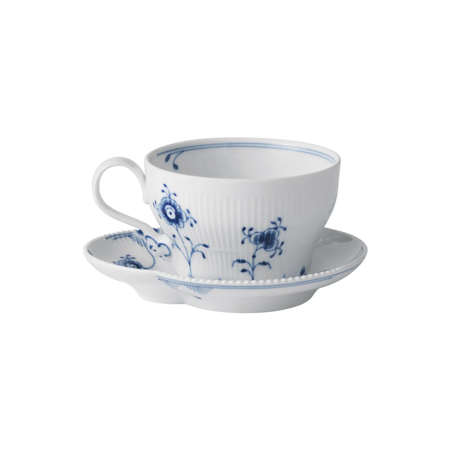 Blå Elements kop og underkop i porcelæn fra Royal Copenhagen. Blå Elements Kop og underkop på 26 cl har et organisk formsprog, som står i kontrast til geometriske felter af rifler og en delikat, takket kant. Steldelene er håndmalede i et kontemporært udtryk, der har fundet inspiration i det klassiske musselmalede mønster. Den elegante kop er særligt velegnet til te.