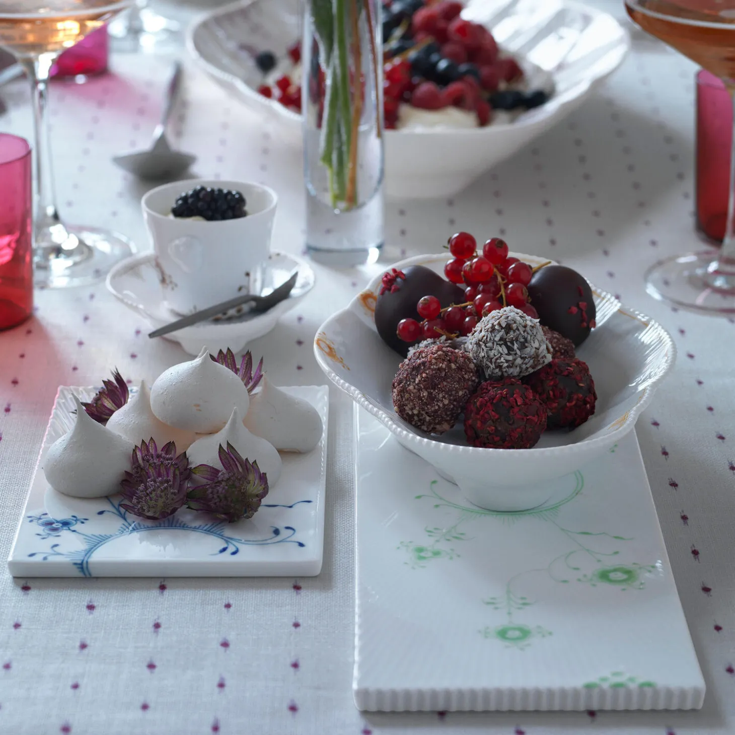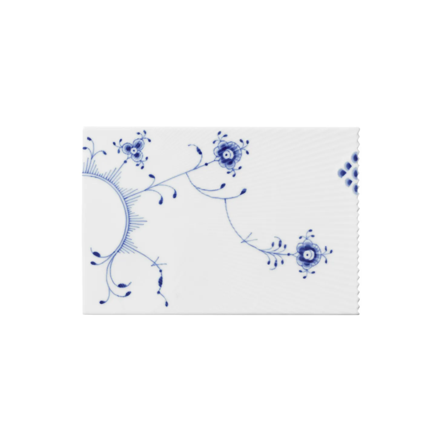 Blå Elements serveringsbræt i porcelæn fra Royal Copenhagen. Dette lille Blå Elements Serveringsbræt på 18 cm er en yndefuld tilføjelse til enhver samling af Royal Copenhagen. Fra den takkede kant stråler taktile rifler, som ender i en halvmåneform, der gengives af de håndmalede linjer, hvorpå blomster og palmetter vokser. Serveringsbrættet skaber en klassisk borddækning med et strejf af en uhøjtidelig elegance, og det kan blandt andet bruges til serveringer af små kager og oste.