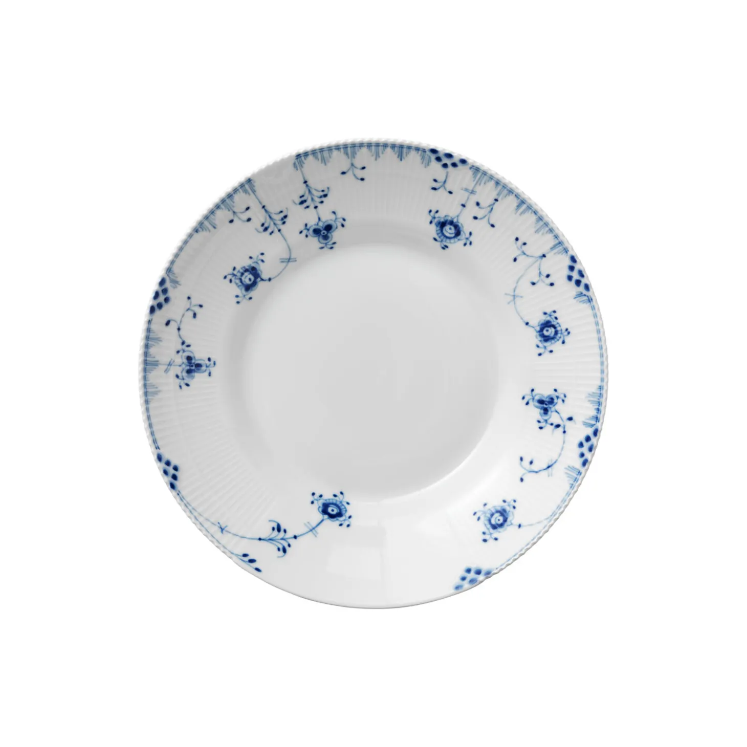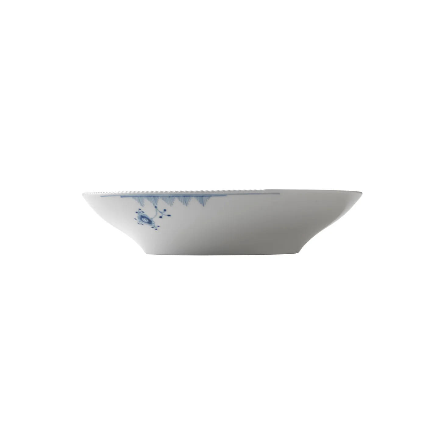Blå Elements skål i porcelæn fra Royal Copenhagen. Den høje kant på denne Blå Elements Skål på 28 cm prydes af et bånd af taktile rifler, der understreges af delikate takker fra det ikoniske Flora Danica-stel. Skålen er håndmalet med et legende mønster af florale elementer, som bærer tydelige referencer til det musselmalede mønster og udstråler en kontemporær uhøjtidelighed. Den funktionelle skål skaber en legende borddækning og kan også bruges som en dyb tallerken.