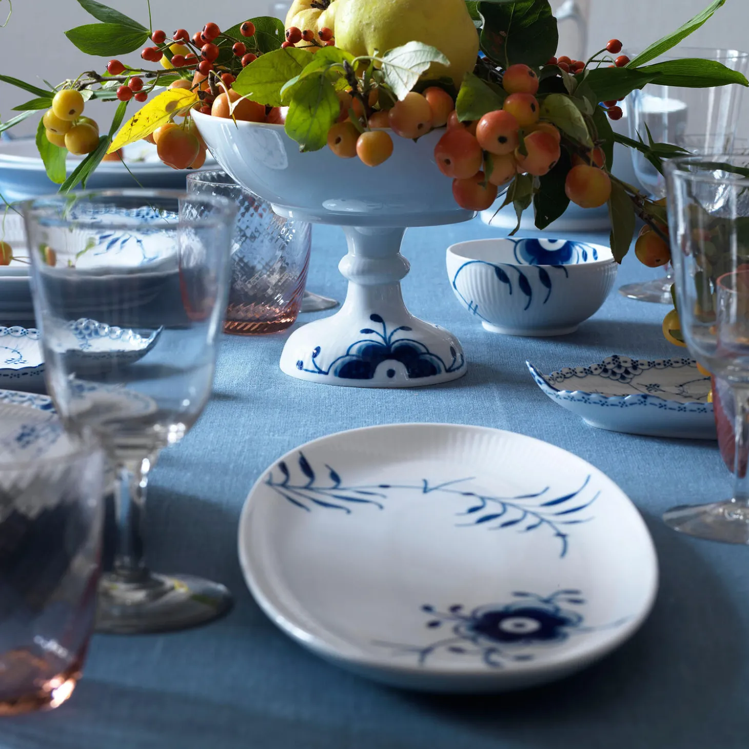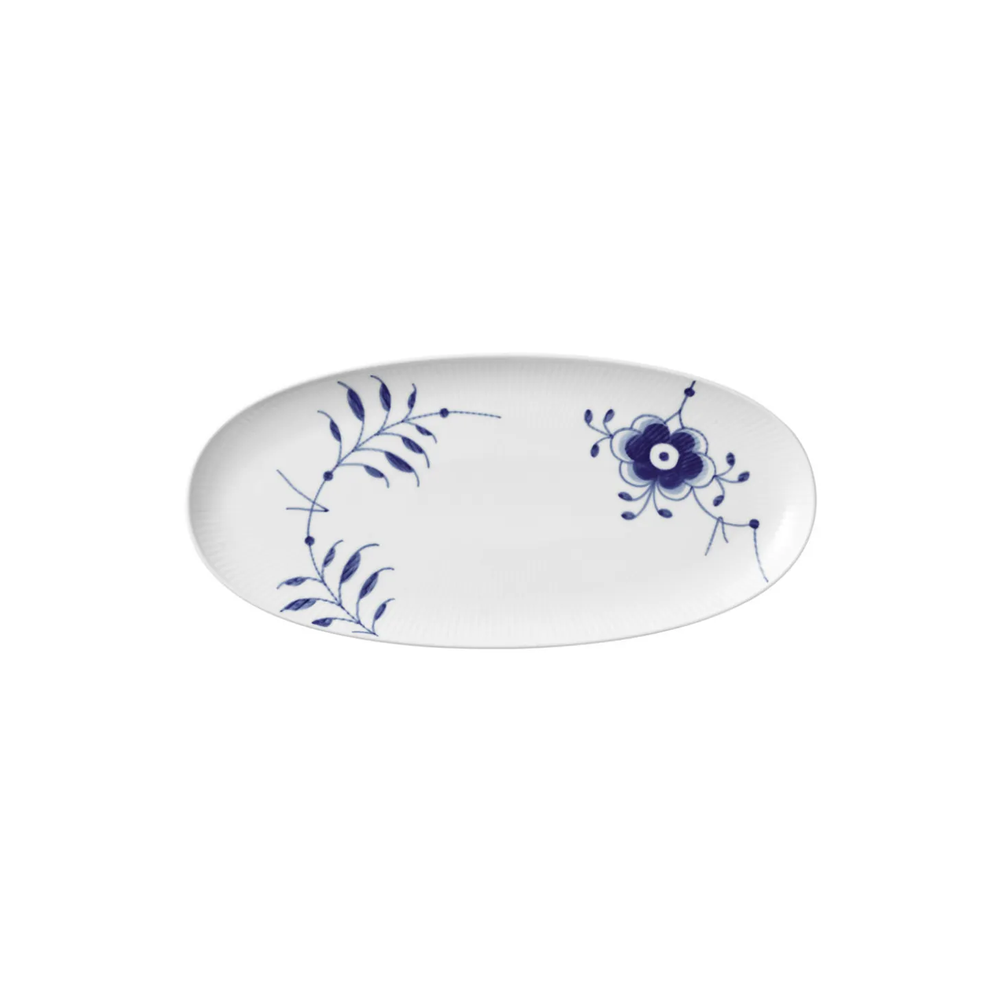 Blå Mega Riflet fad i porcelæn fra Royal Copenhagen. Den aflange, ovale overflade af dette Blå Mega Riflet Fad på 37 cm er håndmalet med stellets iøjnefaldende dekoration, der skaber et udtryk af kontemporær skønhed. Serveringsfadet kan bruges til at arrangere dine livretter på smukkeste vis og pryde et veldækket bord.