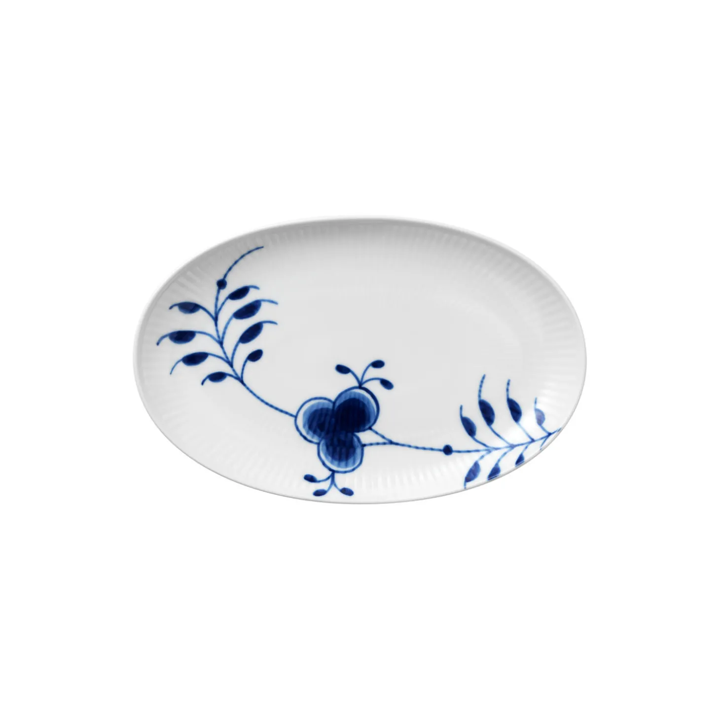 Blå Mega Riflet asiet i porcelæn fra Royal Copenhagen. Dette lille Blå Mega Riflet Fad på 23,5 cm kan bruges som et lille serveringsfad eller en smuk sidetallerken til brød og andet ved middagsbordet. Uanset hvordan fadet bruges, passer det kontemporære mønster naturligt ind i enhver borddækning med sine håndmalede blomsterdekorationer.