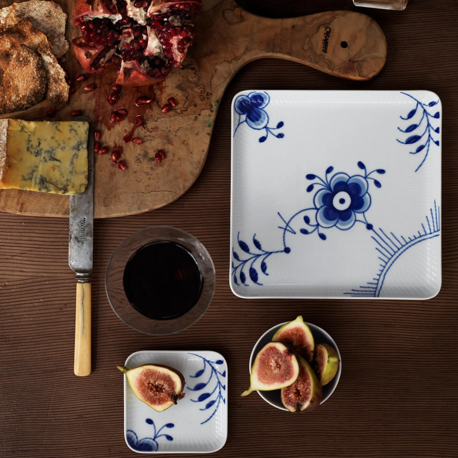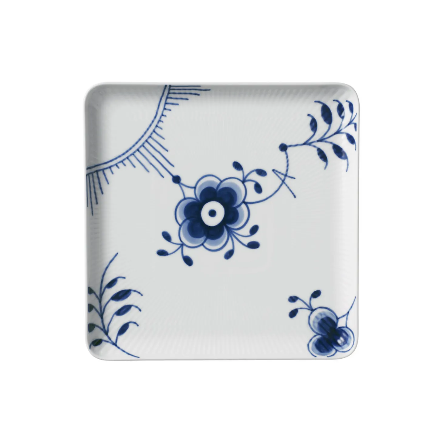 Blå Mega Riflet firkantet asiet i porcelæn fra Royal Copenhagen. Mønsteret fra Blå Mega Riflet er håndmalet med iøjnefaldende elementer på denne elegante tallerken på 20 cm. Overrask dine gæster med anderledes serveringer på den kvadratiske tallerken eller brug den som et smukt og dekorativt element i hjemmet.