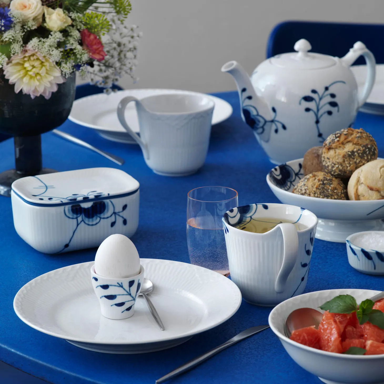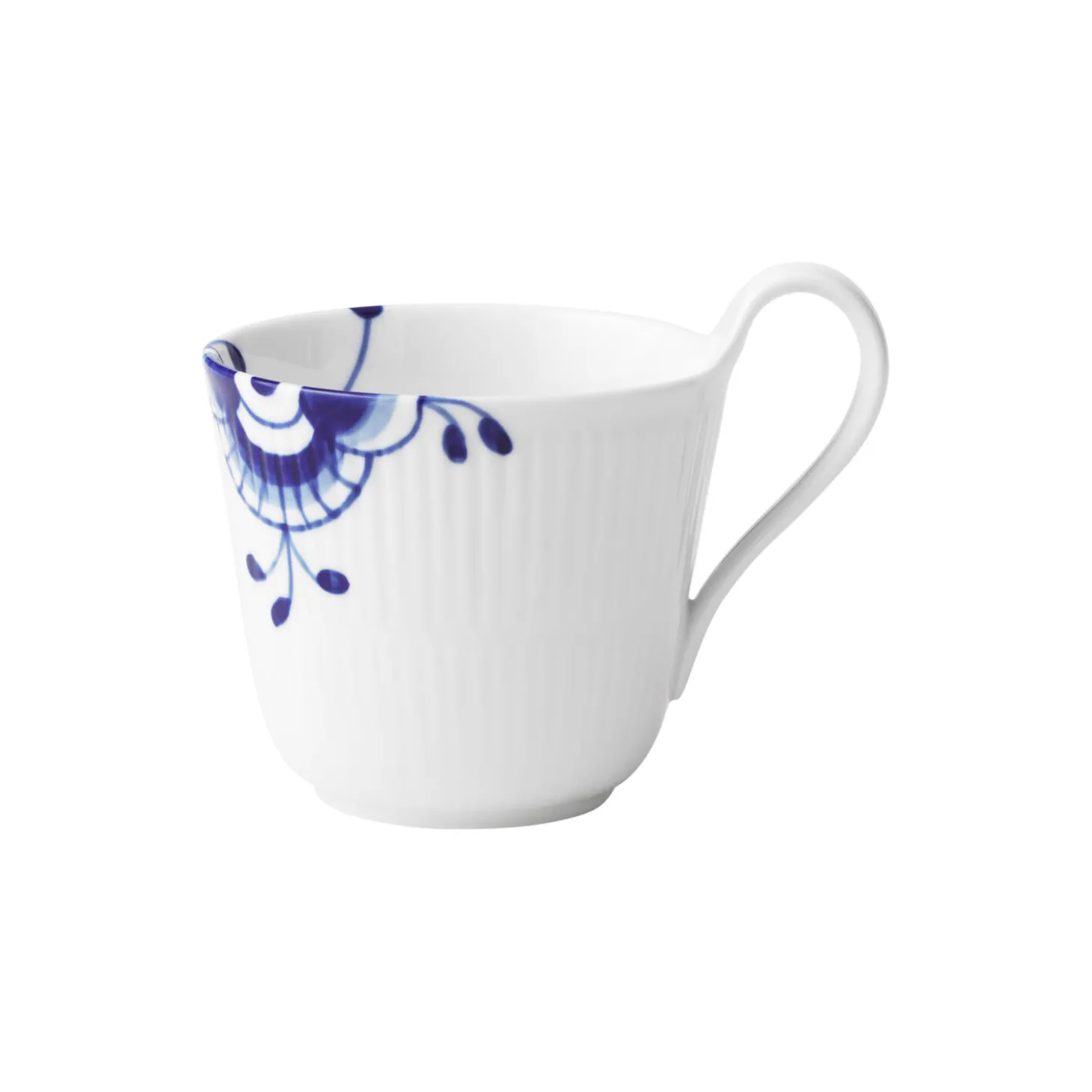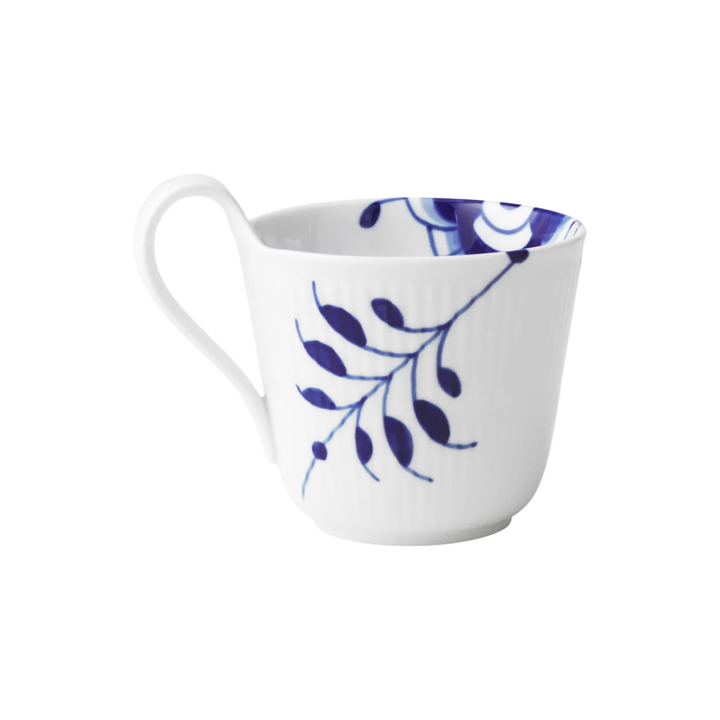 Blå Mega Riflet højhankskop i porcelæn fra Royal Copenhagen. En forstørret, håndmalet blomst og palmette draperer sig ned ad siderne på højhankskoppen i det iøjefaldende Blå Mega Riflet-mønster. Koppen på 33 cl kan fyldes med varme drikke til kolde dage og stille morgener.