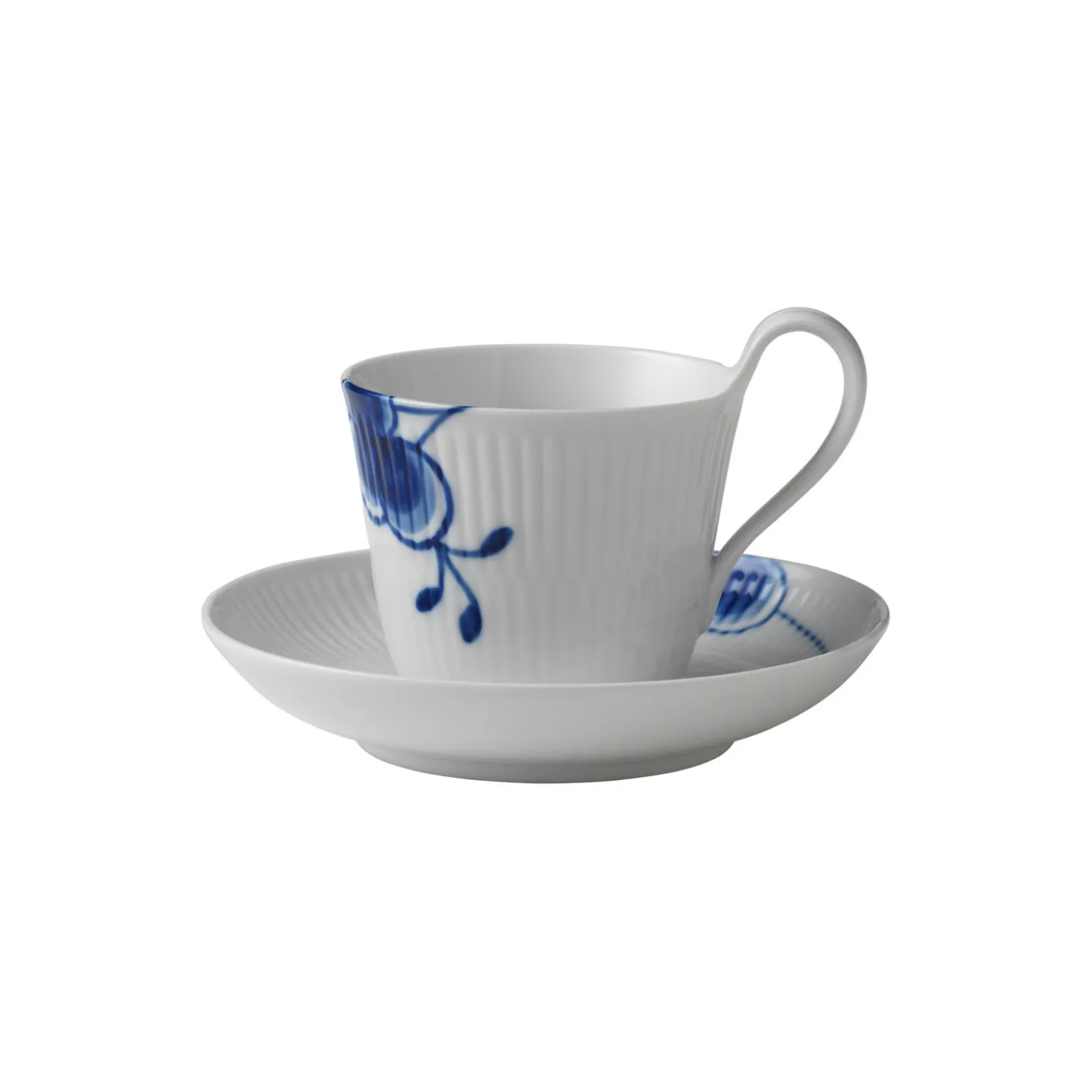 Blå Mega Riflet højhankskop med underkop i porcelæn fra Royal Copenhagen. Højhankskoppen og underkop på 24 cl i Blå Mega Riflet er ideel til enhver varm drik. Det håndmalede mønster af forstørrede elementer skaber et kontemporært udtryk, der giver et spændende modspil til koppens klassiske formgivning.
