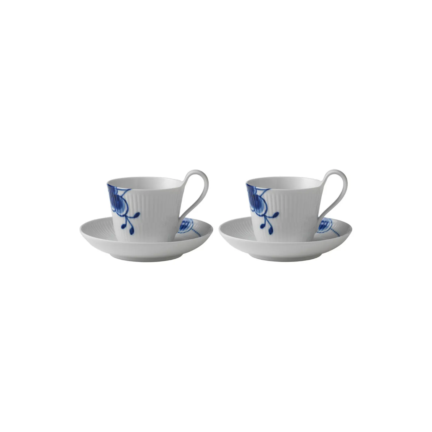 Blå Mega Riflet højhankskop med underkop i porcelæn fra Royal Copenhagen. Højhankskoppen og underkop på 25 cl i Blå Mega Riflet er ideel til enhver varm drik. Det håndmalede mønster af forstørrede elementer skaber et kontemporært udtryk, der giver et spændende modspil til koppens klassiske formgivning.