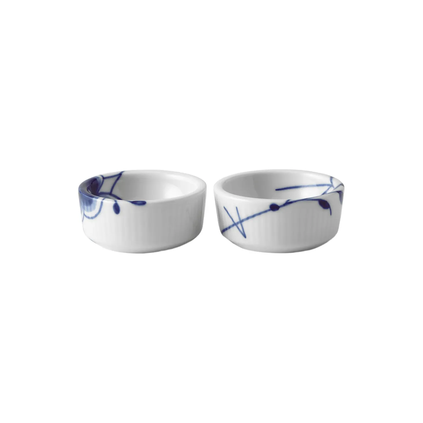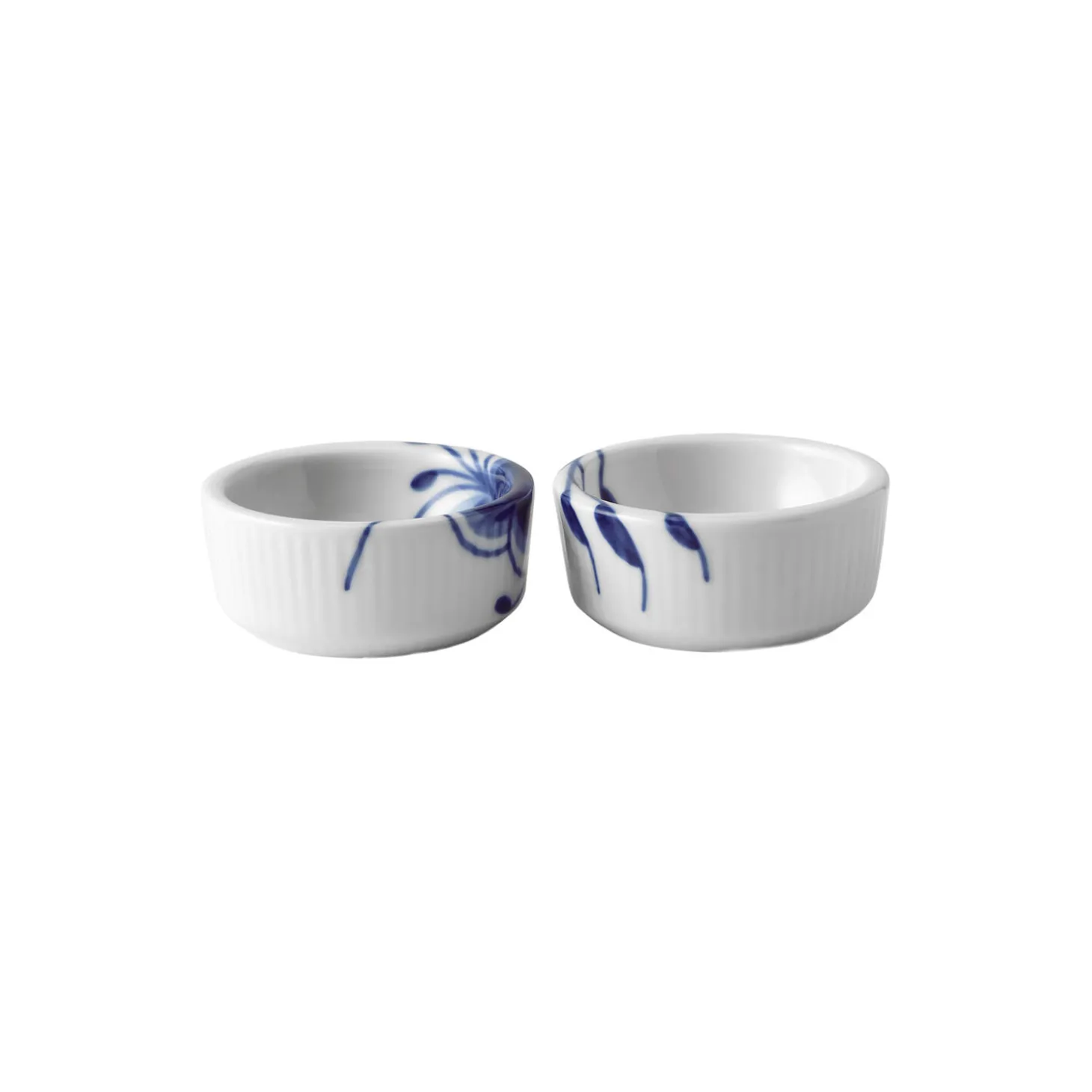Blå Mega Riflet skål i porcelæn fra Royal Copenhagen. På de to, små Blå Mega Riflet Kar på 3 cl er håndmalet henholdsvis en stiliseret krysantemum og en palmette, som tilsammen giver et fuldendt Blå Mega Riflet udtryk. Brug de små kar til salt eller små ejendele.