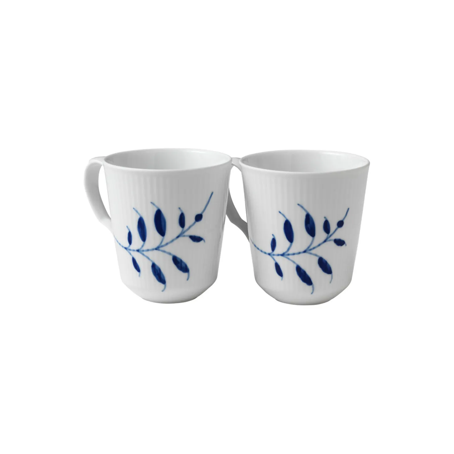 Blå Mega Riflet krus i porcelæn fra Royal Copenhagen. Et gammelt design blev nyfortolket for at skabe dette 38 cl krus til Blå Mega Riflet. På dette sæt af to krus er der håndmalet forstørrede elementer fra det musselmalede mønster i et kontemporært udtryk, der kan skabe særlige minder for to.