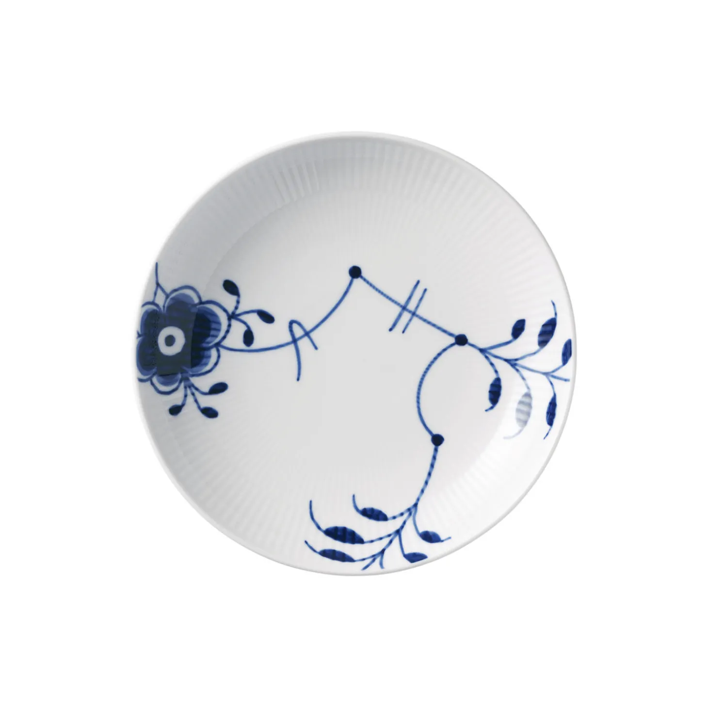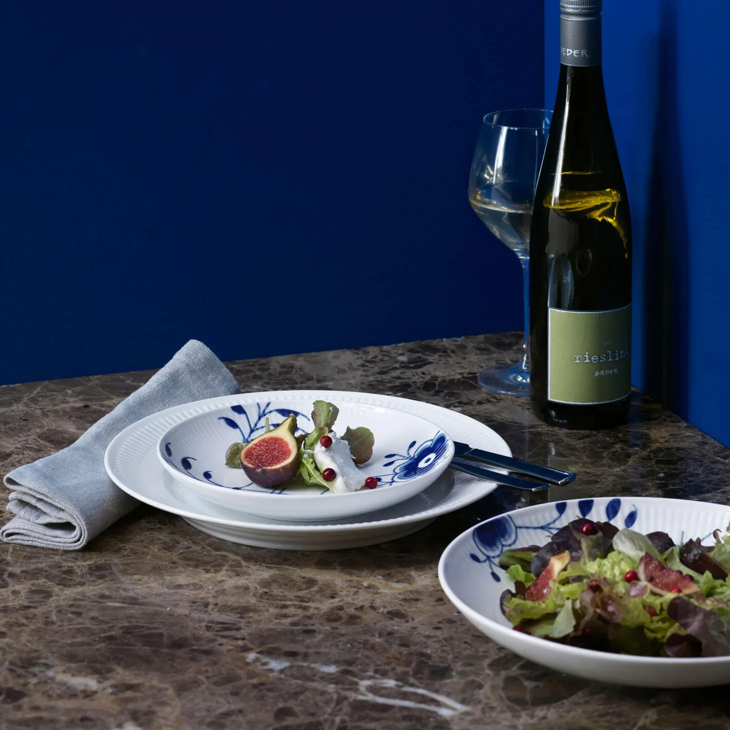 Blå Mega Riflet moderne frokosttallerken i porcelæn fra Royal Copenhagen. Denne tallerken på 20 cm har høje kanter, der gør tallerkenen velegnet til også at fungere som en lav skål. En håndmalet krysantemum og smukke palmetter pryder tallerkenen i det iøjefaldende mønster fra Blå Mega Riflet, som skaber en nutidig borddækning og en smuk baggrund for uforglemmelige minder.