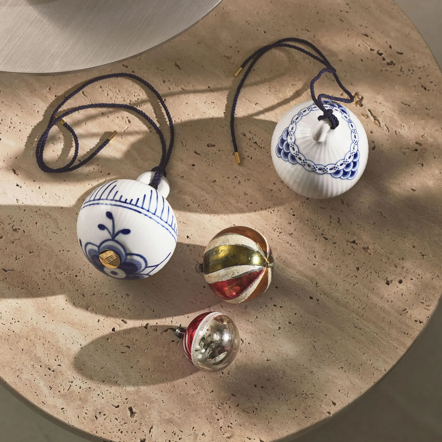 Royal Copenhagens porcelænsjulekugler er perfekte samlerobjekter. De smukke julekugler er håndmalet med Royal Copenhagens klassiske mønstre og ser smukke ud på juletræet eller hængende fra en gren i vindueskarmen. Sættet med to kugler har en smuk kombination af mønstrene fra Blå Mega Riflet og Prinsesse.
