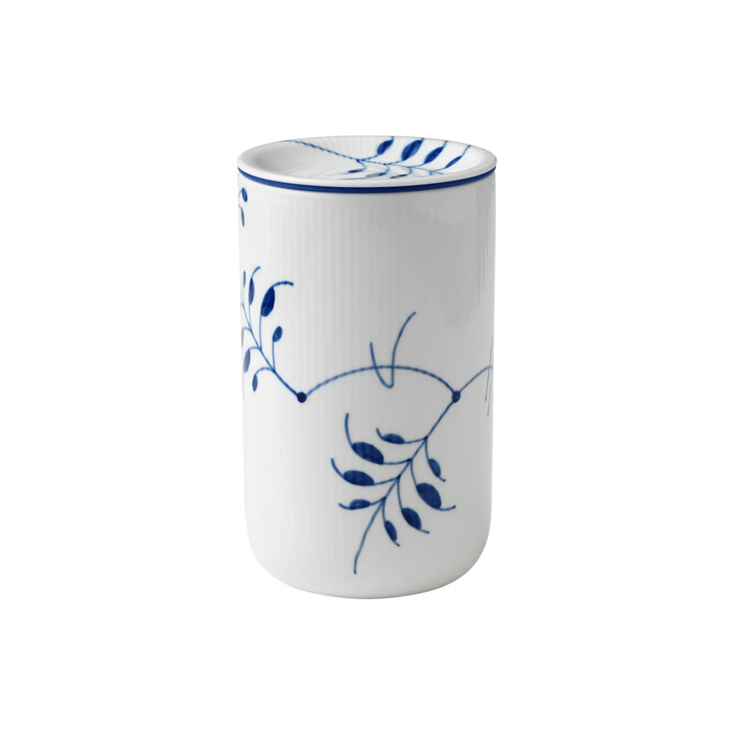 Blå Mega Riflet opbevaringskrukke i porcelæn fra Royal Copenhagen. Den håndmalede Opbevaringskrukke med låg på 115 cl i Blå Mega Riflet er ideel til tørvarer. Stiliserede palmetter og blomster i forstørrede udgaver pryder krukken i et mønster, som komplimenterer ethvert andet Royal Copenhagen stel. Silikonekanten i låget holder krukken lufttæt og forsyner porcelænskrukken med et ekstra strejf af den klassiske, blå farve.