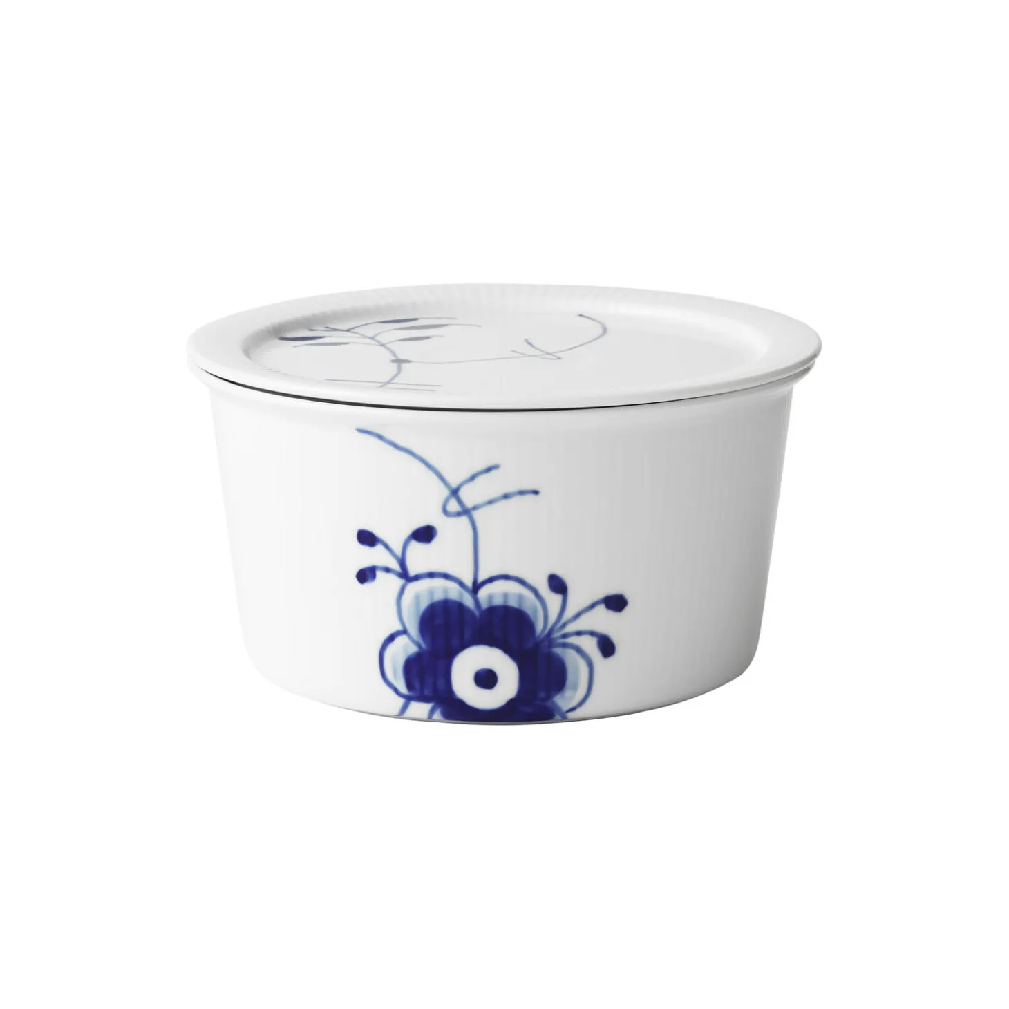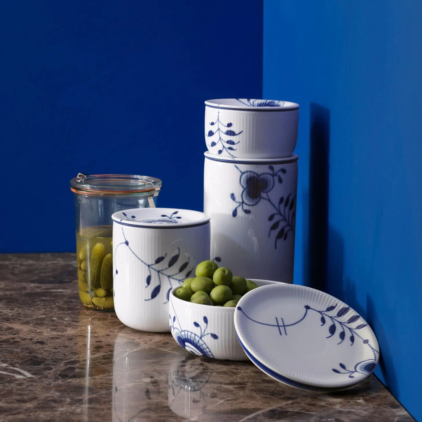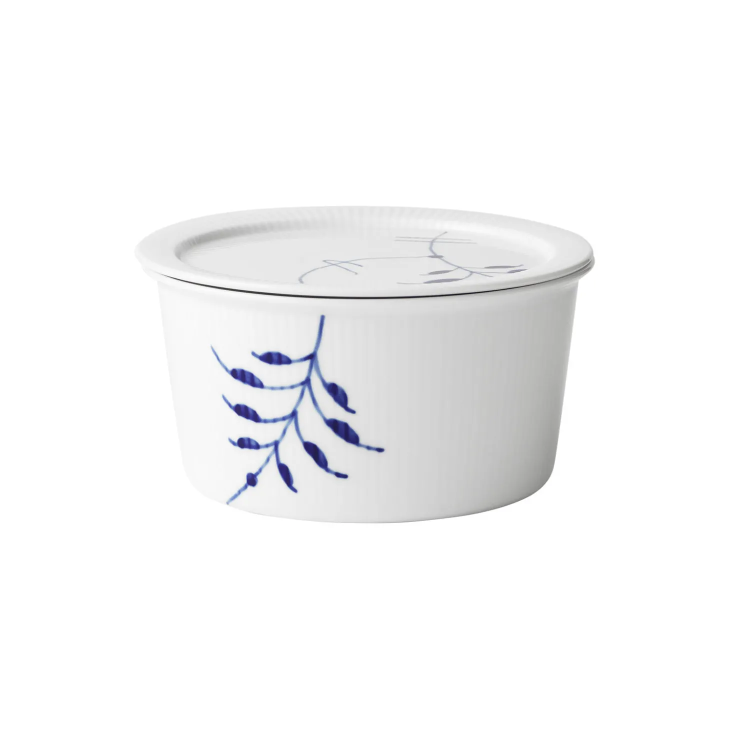 Blå Mega Riflet skål med låg i porcelæn fra Royal Copenhagen. Denne Skål med låg på 100 cl i Blå Mega Riflet overrasker på ethvert bord med iøjefaldende, håndmalede elementer af stiliserede blomster og palmetter. Det flade låg skaber et enkelt udtryk og gør samtidig skålen stabelbar.