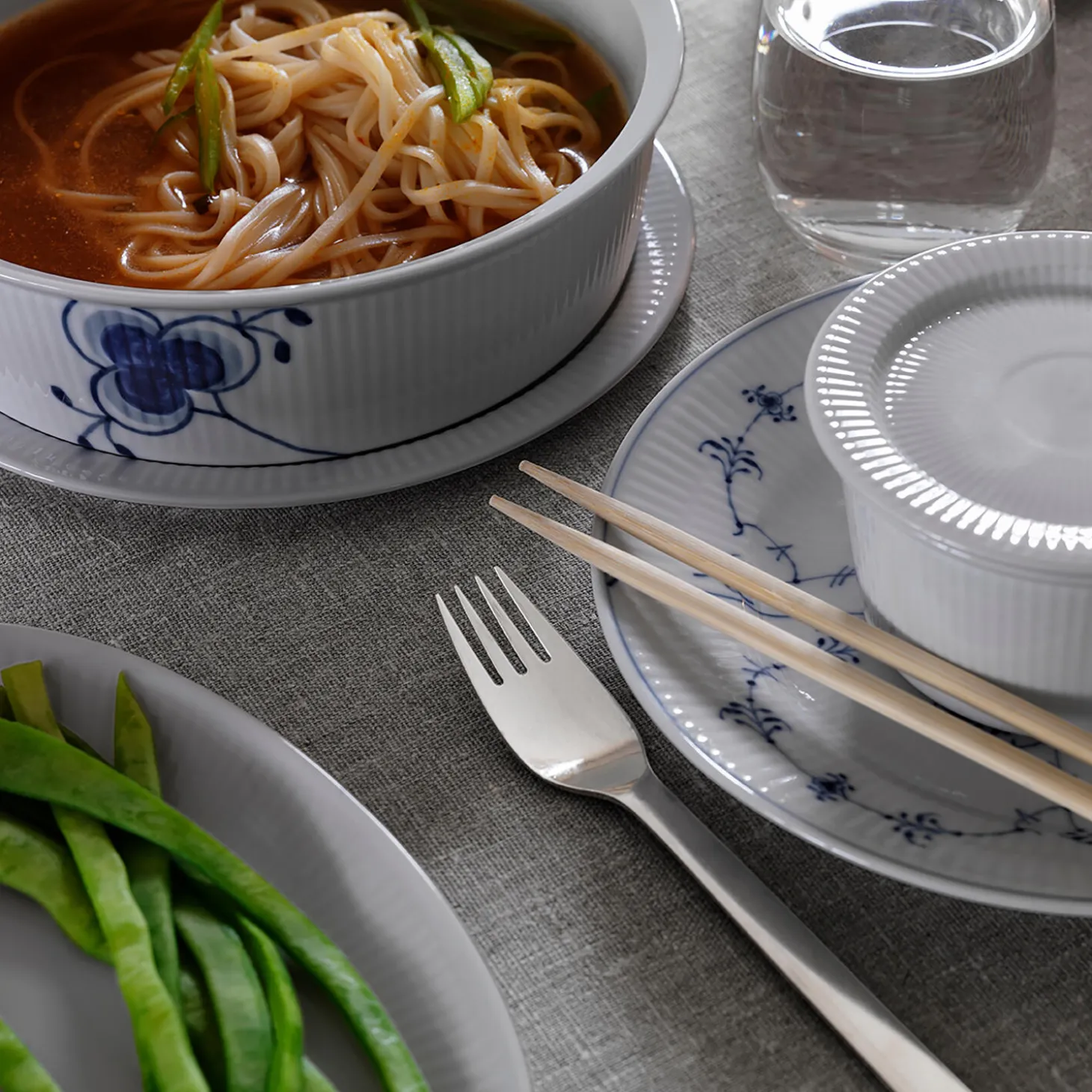 Blå Mega Riflet skål med låg i porcelæn fra Royal Copenhagen. Denne lave skål med låg på 145 cl er smukt håndmalet i det iøjefaldende mønster fra Blå Mega Riflet. Porcelænsskålen prydes af forstørrede elementer fra det klassiske musselmalede mønster som skaber et kontemporært udtryk på det riflede porcelæn. Det flade låg på skålen gør den stabelbar.