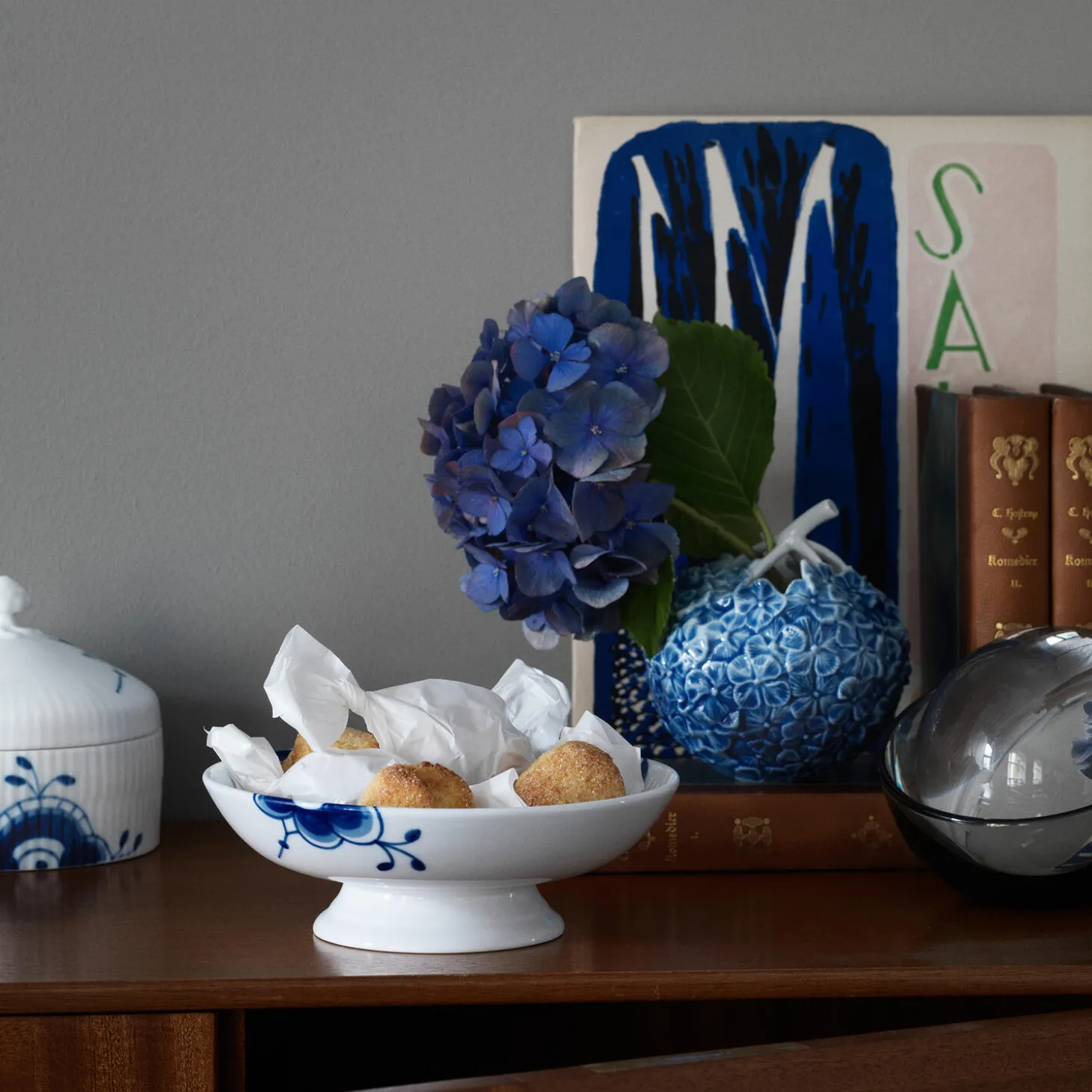 Blå Mega Riflet skål på fod i porcelæn fra Royal Copenhagen. Denne lille Blå Mega Riflet Skål på fod med en højde på 6 cm er ideel som serveringsskål til små sideretter eller blot som et smukt element i hjemmet. Skålen prydes af håndmalede blomster og palmetter der elegant snor sig om porcelænsskålens sider i et forstørret udtryk.