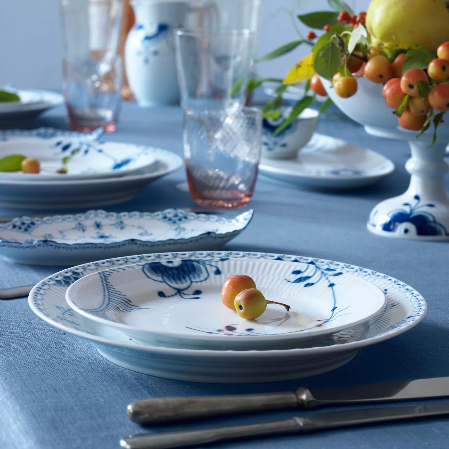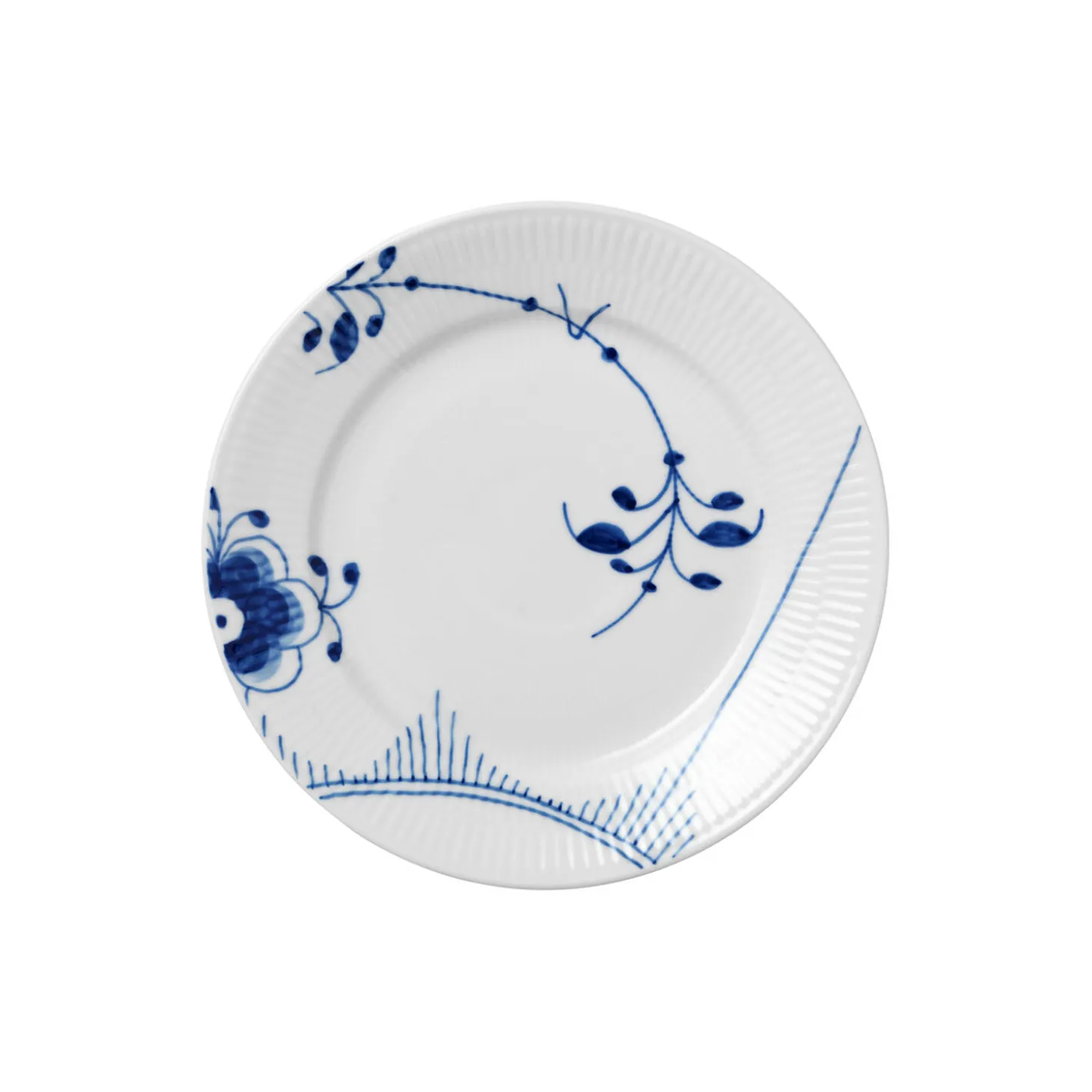 Blå Mega Riflet frokosttallerken i porcelæn fra Royal Copenhagen. Dekoration #2. Farve: hvid/blå. Mål: Ø 22 cm. Design: Karen Kjældgård-Larsen.